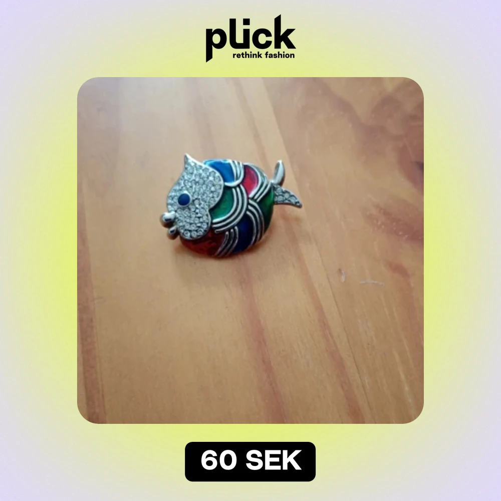 Vacker liten brosch mönstrad med olika färger silverfärgade fisk.