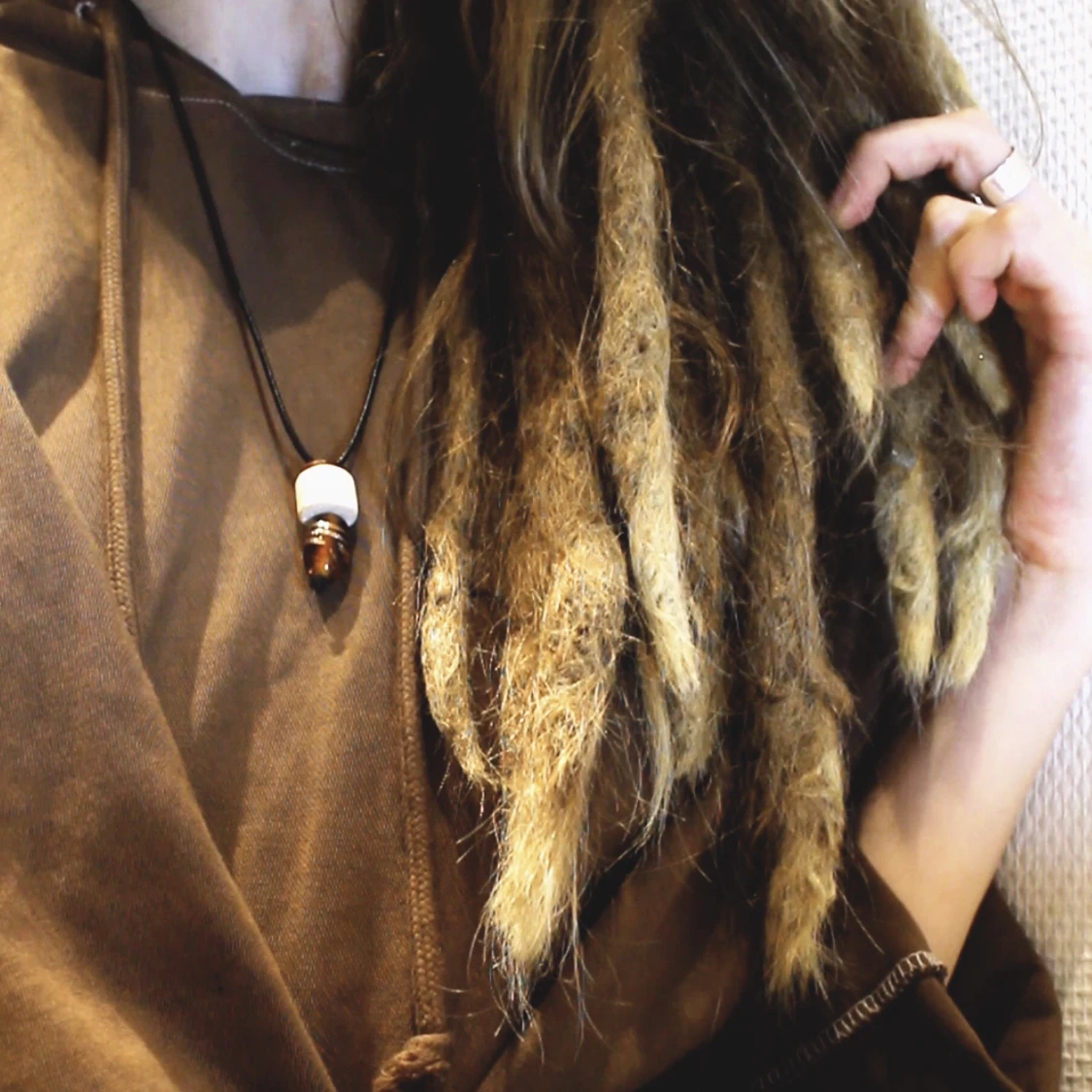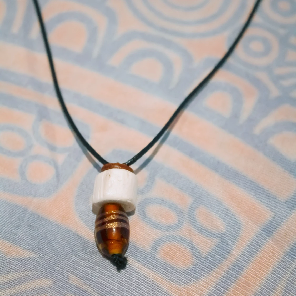Handgjort (av mig) halsband med pärlor av trä och glas. Halsbandet har ett klassiskt knäppe av metall i nacken. 🤎