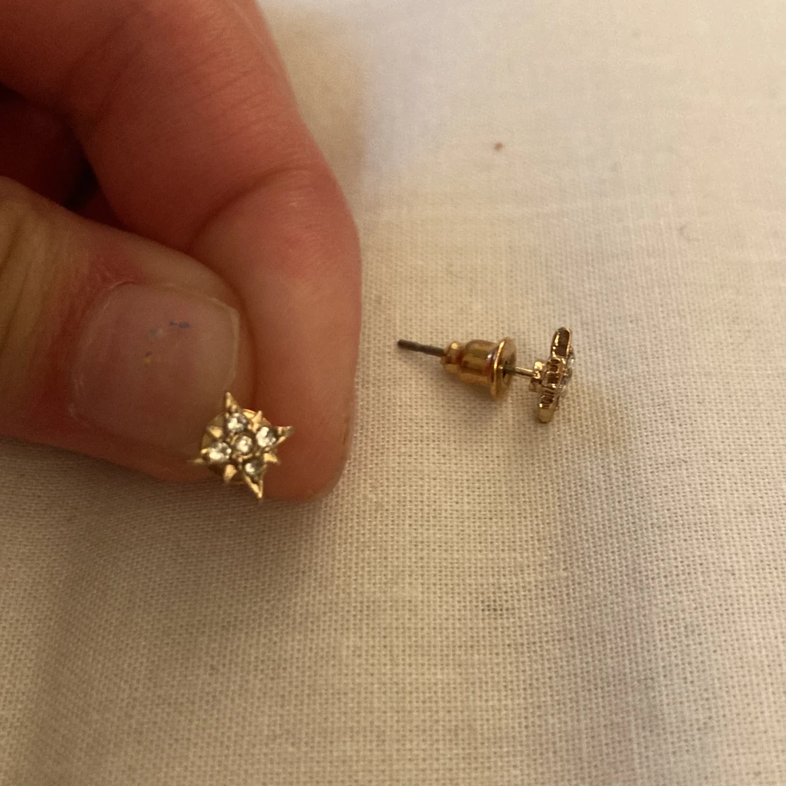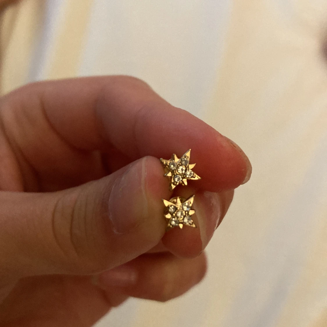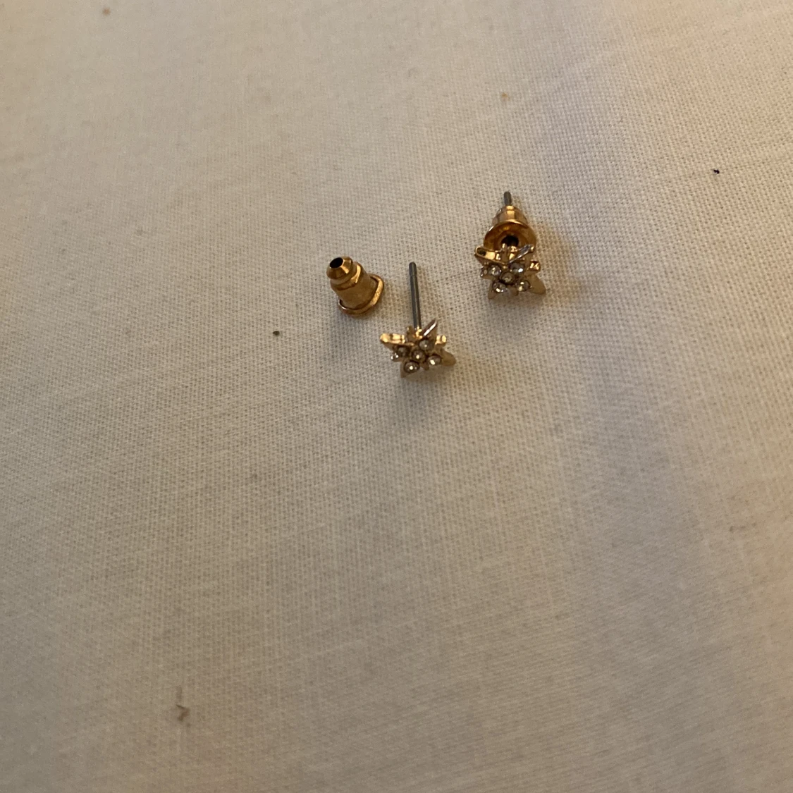 Guldiga örhängen som en slags Cristall med småsimvriga pärlor i sig,grå nål, med plupp.👍