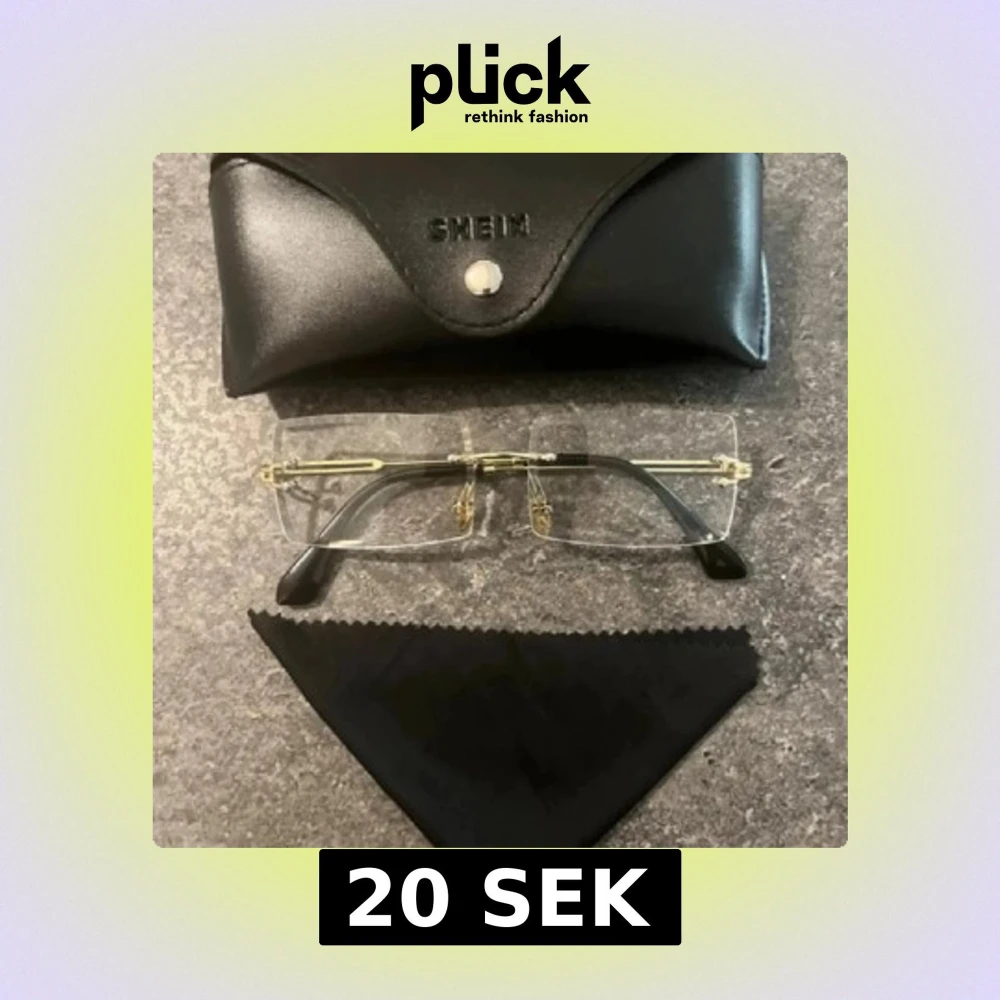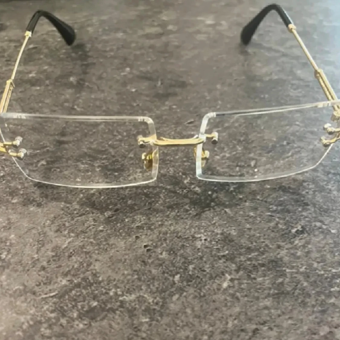 Stilrena rektangulära glasögon med transparenta linser och tunna guldfärgade bågar. Skalmarna är smala med svarta ändar och näskuddar för extra komfort. Perfekt accessoar för en modern look :)