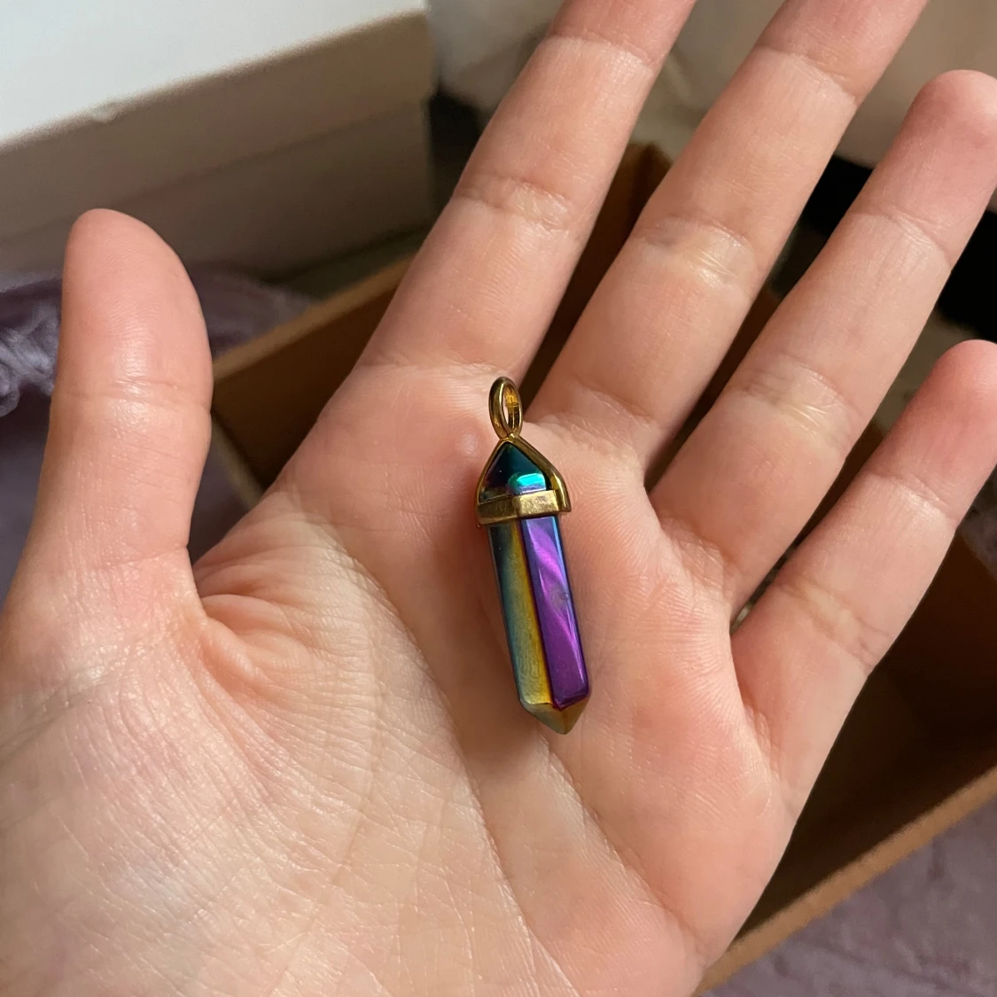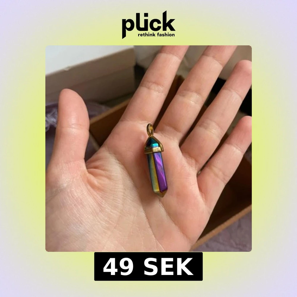 Unikt halsbandshänge i regnbågsfärgad kristall med metallfäste i guldton. Kristallen är slipad i en spetsig, avlång form och skimrar i blått, lila, gult och grönt. Perfekt för dig som gillar färgstarka och magiska accessoarer.
