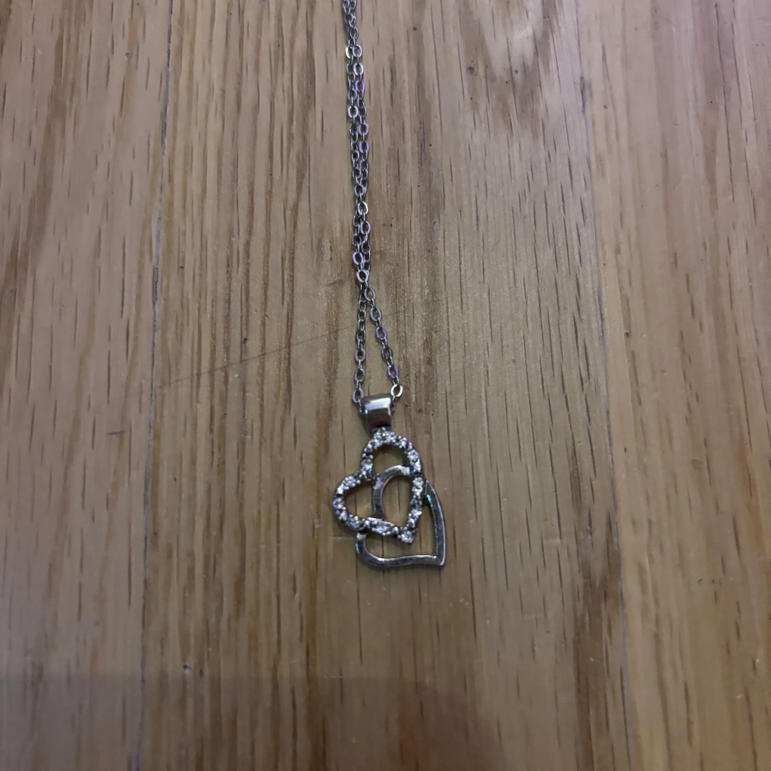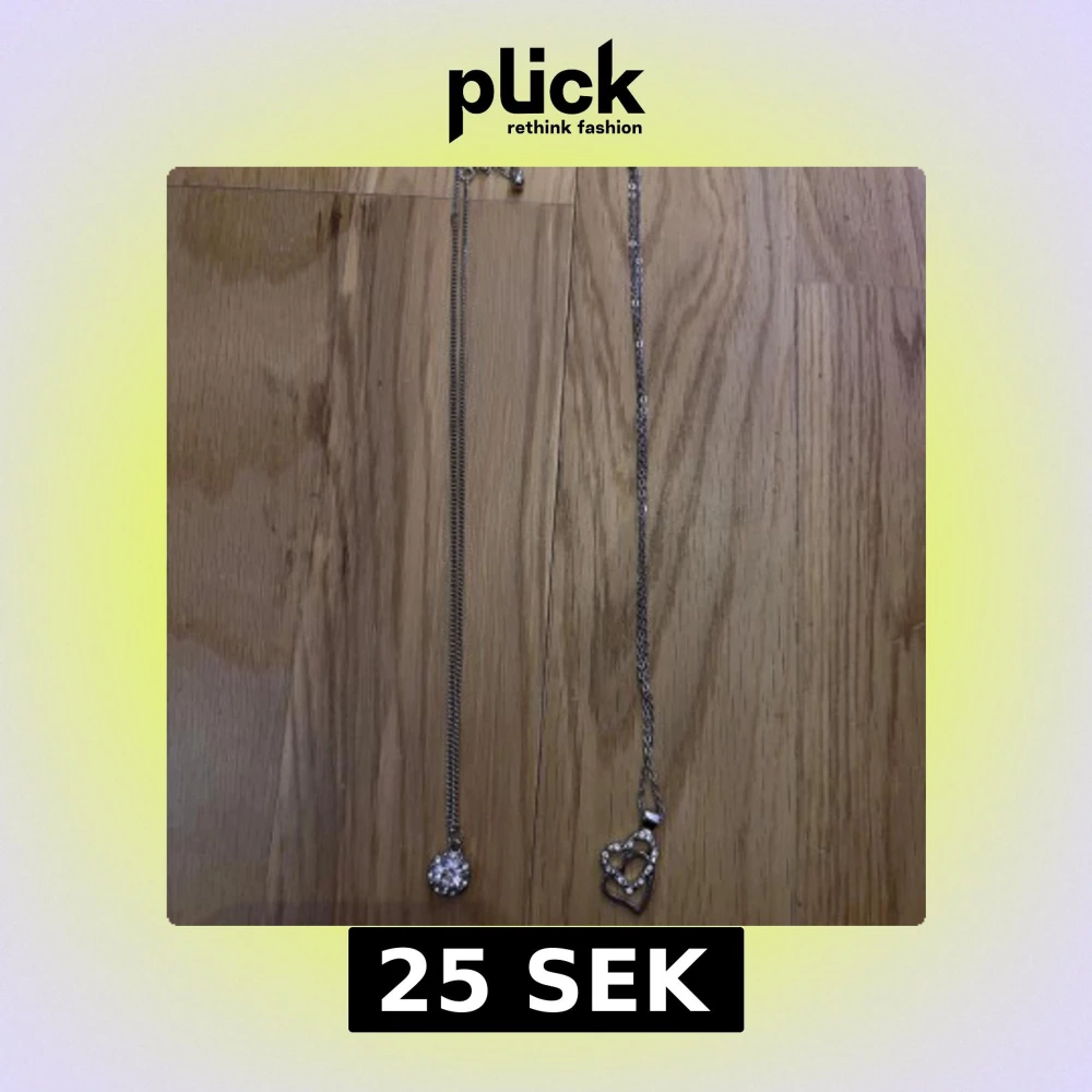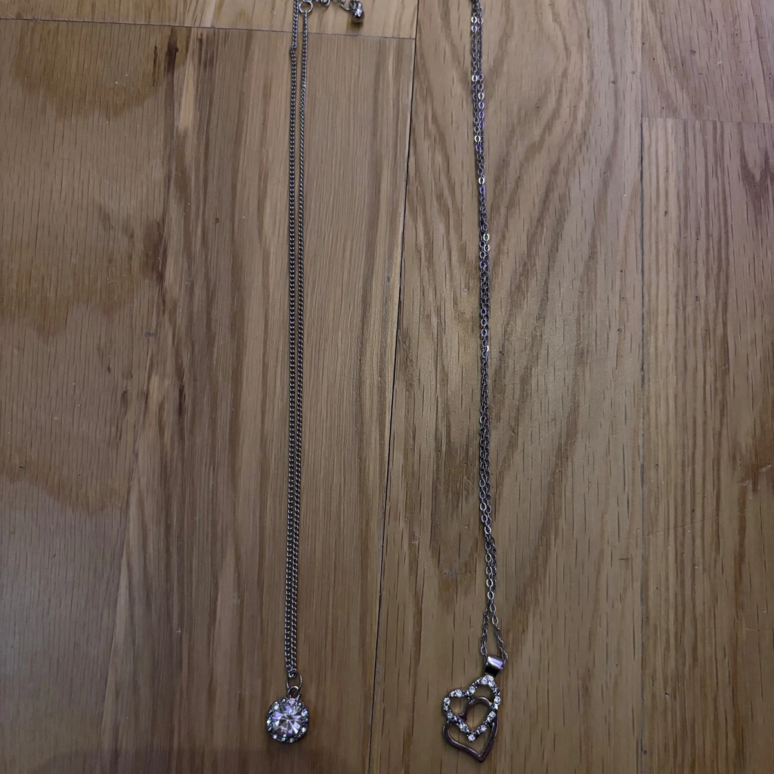 Säljer två snygga halsband i silverfärg. Ett har en rund hängande sten med glittrande kant, det andra har ett hänge med två hjärtan där det ena är dekorerat med små stenar. Perfekt för dig som gillar bling och söta detaljer.