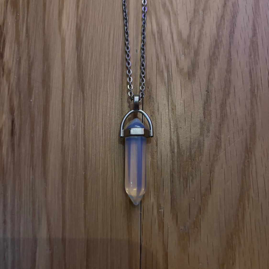Snyggt halsband med en tunn silverfärgad kedja och ett hänge i form av en spetsig kristall. Kristallen har en skimrande vit och blå ton som ger ett magiskt intryck. Perfekt för dig som gillar unika smycken med lite mystisk vibe.