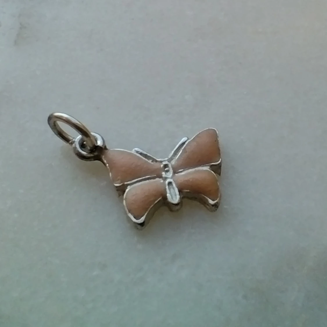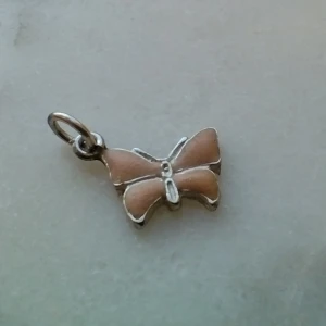 Litet hänge i äkta silver. Stämplad 925 och något mer som jag inte kan tyda. Rosa/persikofärgad framsida - ganska matt och lite ojämn yta. Ca 1 cm bred. Frakt 13 kr.
