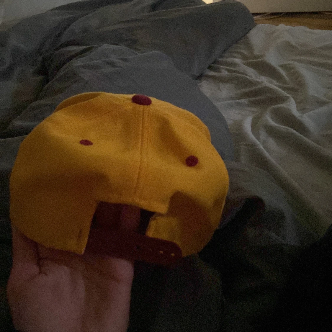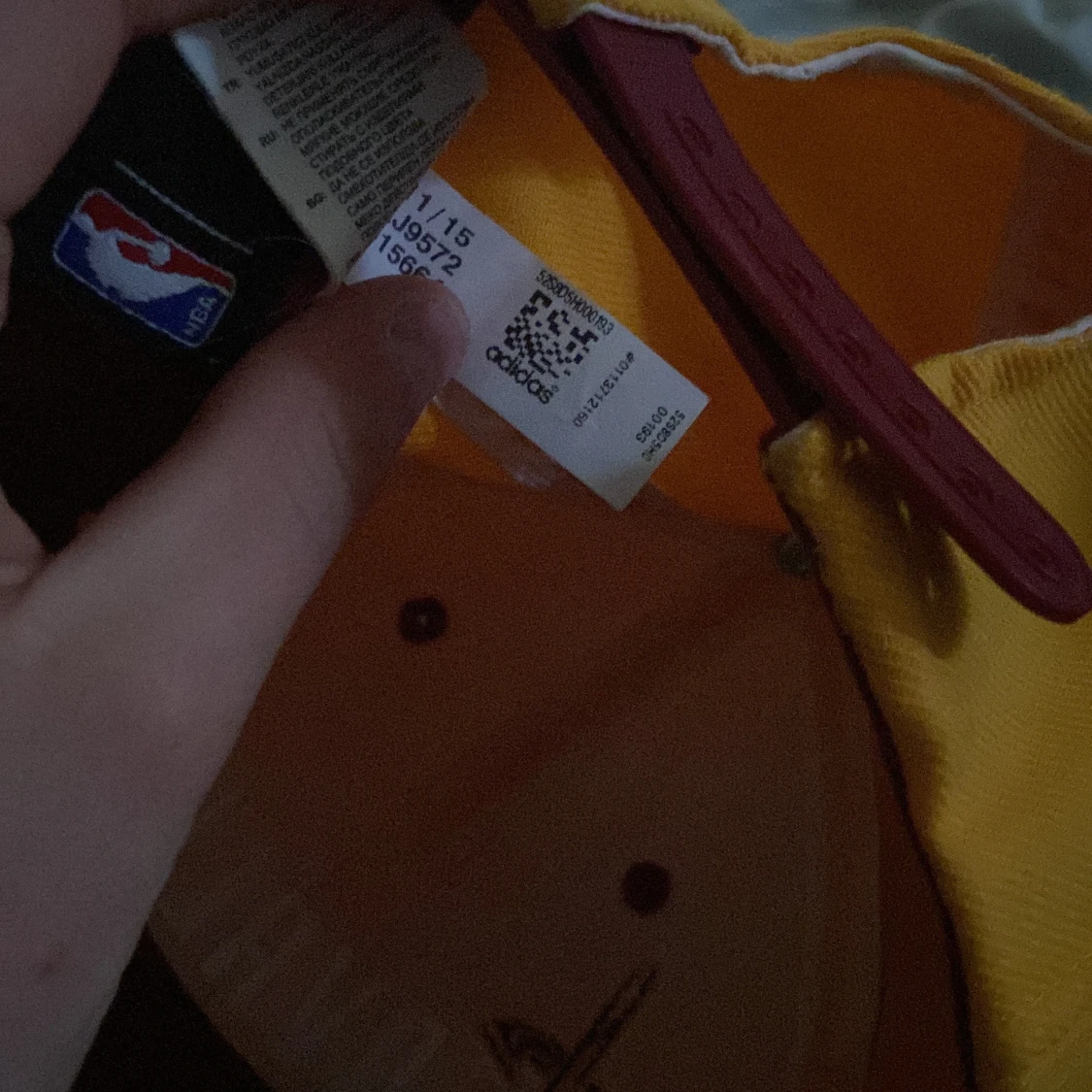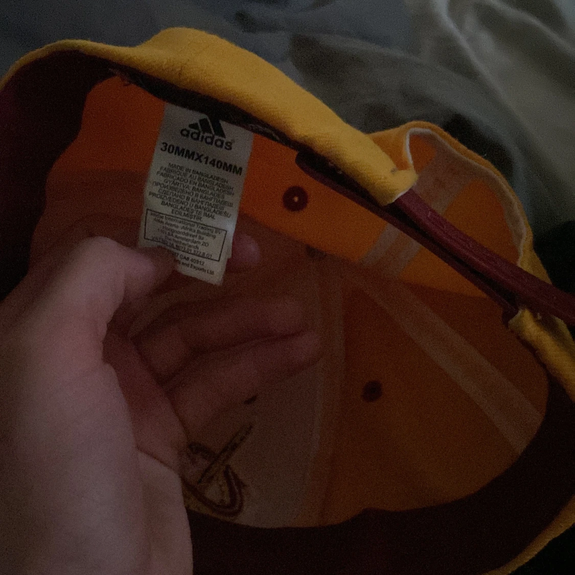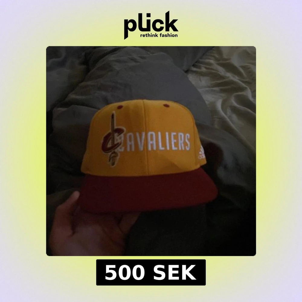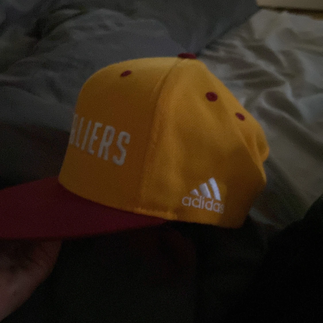 Gul och vinröd keps med Cavaliers-logga och text framtill. Justerbar baksida med hål för ventilation. Officiell NBA-produkt från Adidas, perfekt för basketfans.