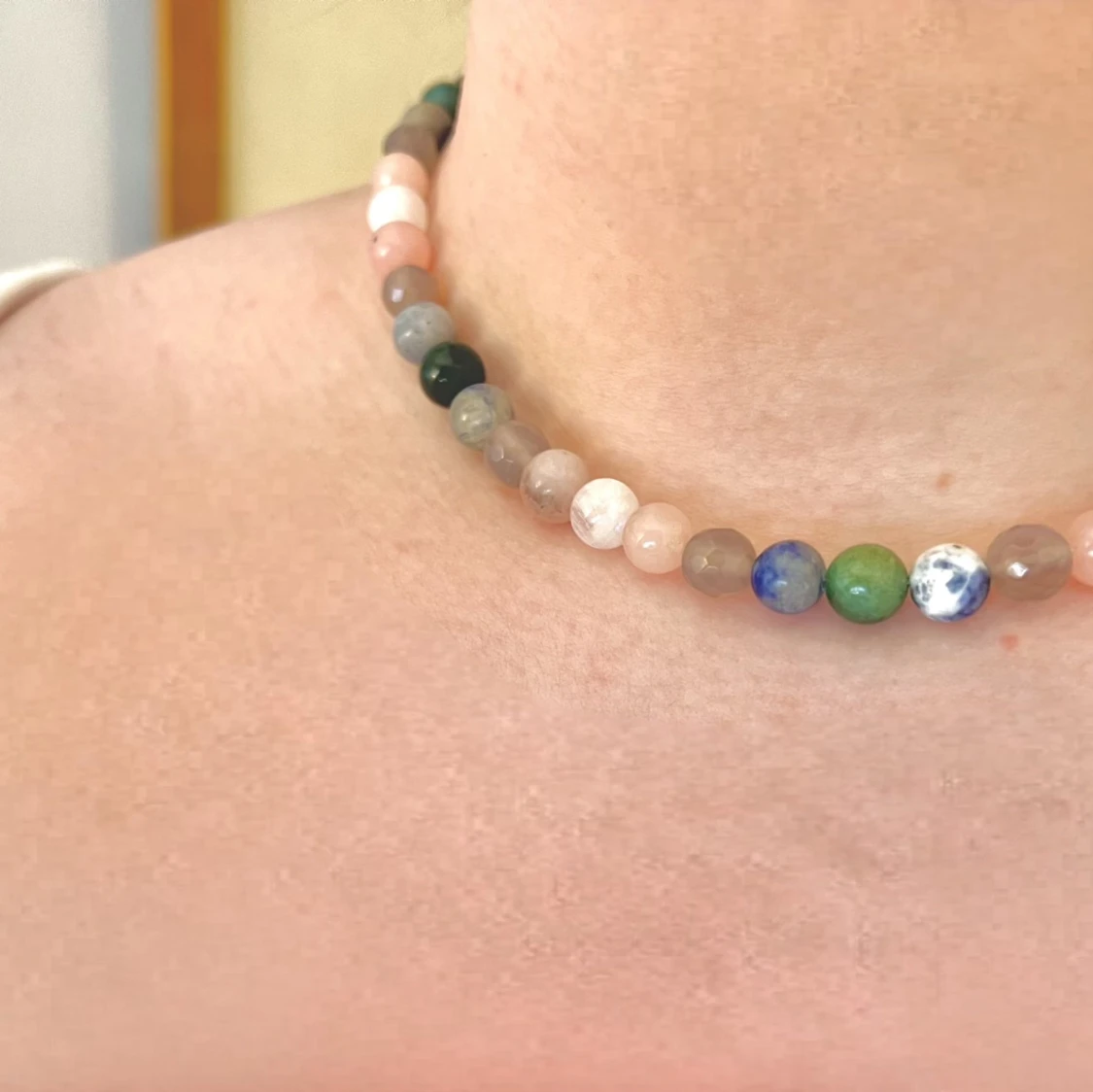 Vackert pärlhalsband med kristaller. 7 st mossagat, 12 st sodalite, 12 st grå facetterad agat, 12 st cherry jasper, 6 st regnbågsmånsten. Lås i guldpläterat silver. Längd ca. 42 cm.