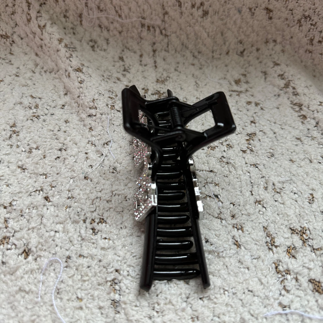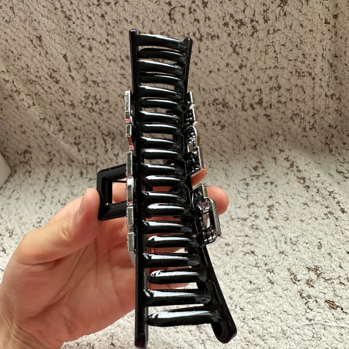 Cool svart hårklämma med stora glittriga silverbokstäver som stavar 'WEB'. Klämman är i plast och bokstäverna är täckta av små gnistrande stenar som ger en extra bling-effekt. Perfekt accessoar för att lyfta din look och hålla håret på plats.