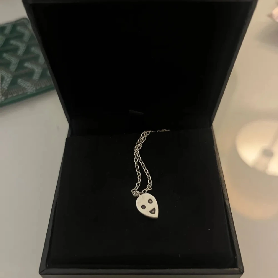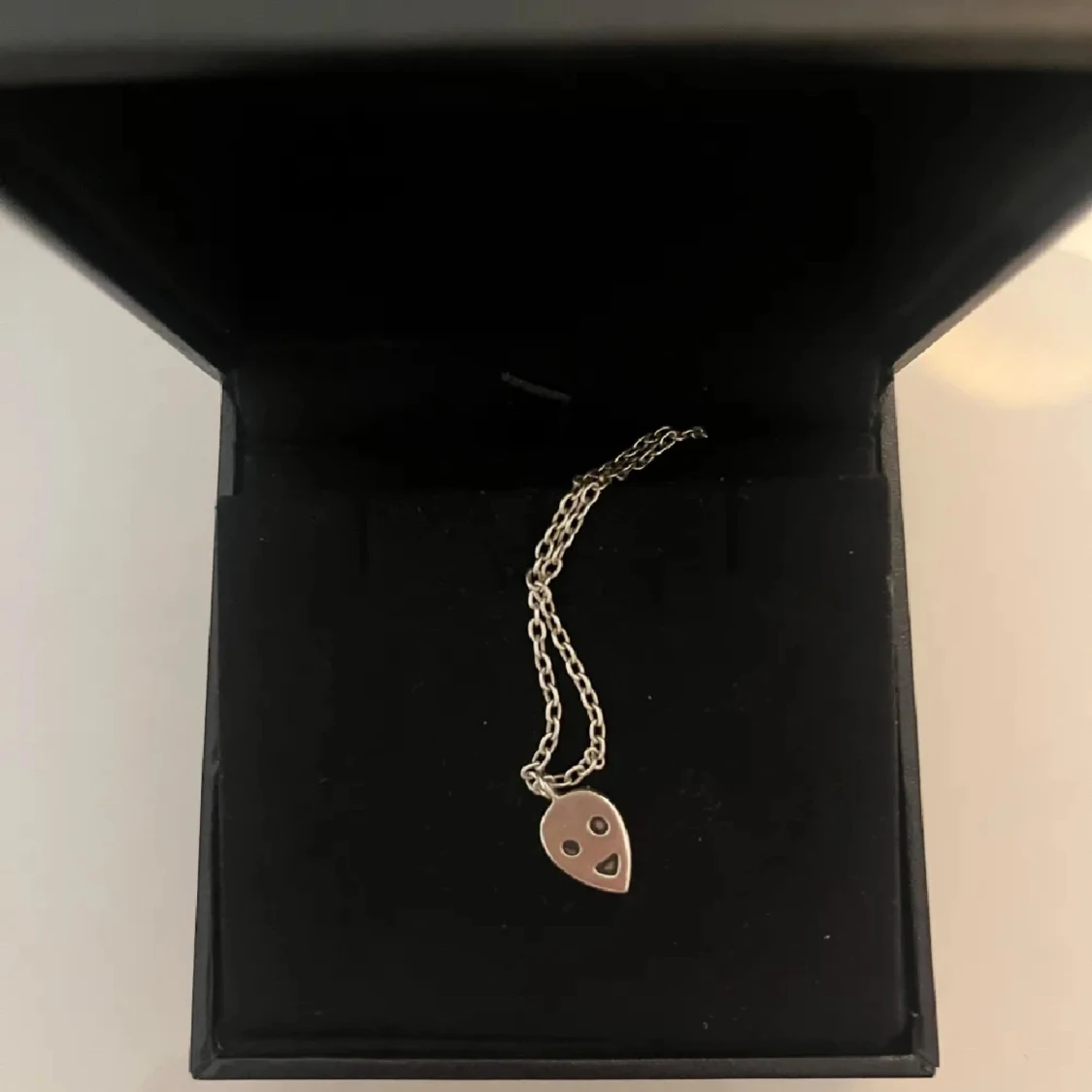 Säljer ett stilrent silverhalsband från Maria Nilsdotter med ett litet alien hänge som har utskurna detaljer. Perfekt accessoar för att lyfta din look. 45 cm, 925 silver.