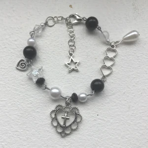 handgjort armband med vita och svarta pĂ€rlor đ€ justerbar passform, se mĂ„tt pĂ„ bild 2. skriv gĂ€rna vid funderingar đ (frakt: 15kr, skickas som brev)