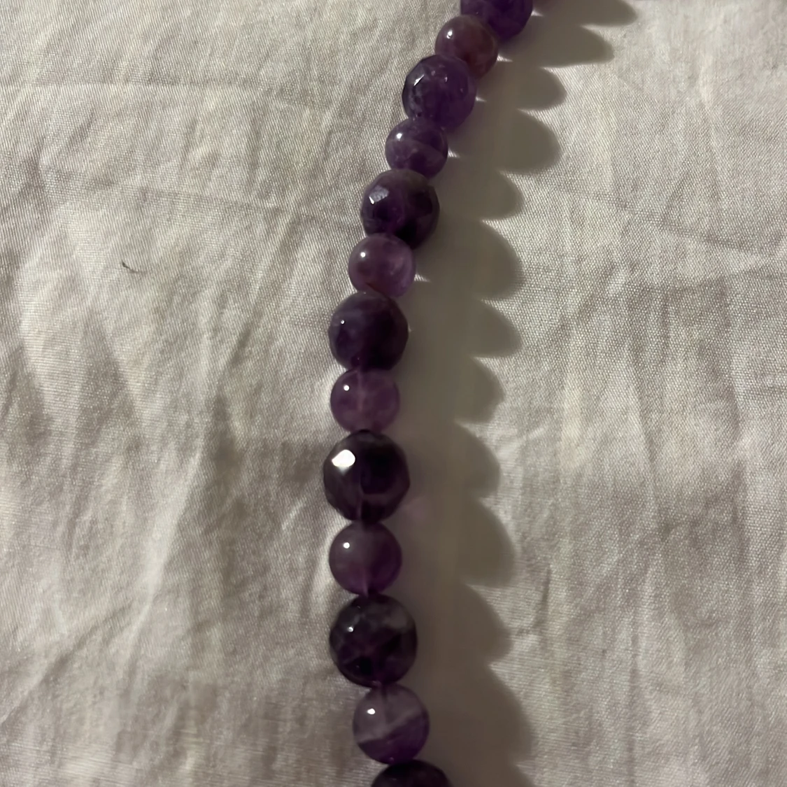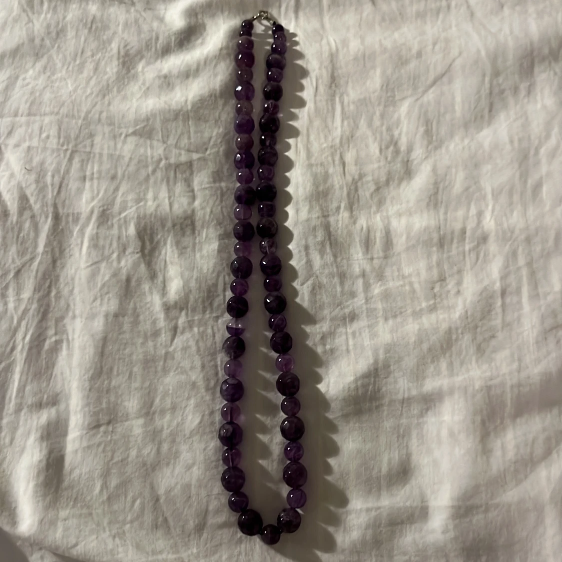 Jättefint äkta ametist halsband. Dem mindre pärlorna är helt runda och de större är slipade vilket gör att dem blänker jätte fint i ljuset. Inte använd särskilt mycket och inga skador. Pris går att diskuteras!