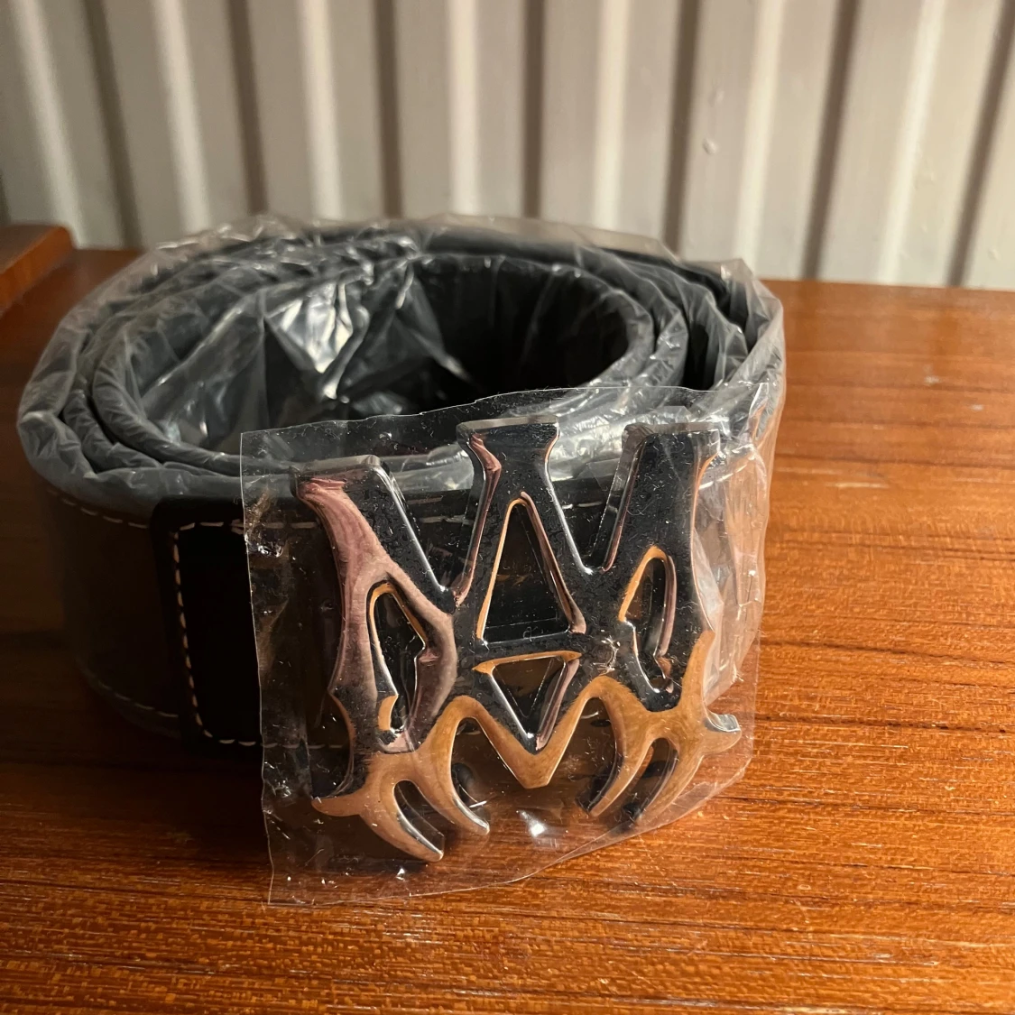 Snyggt svart Amiri bälte i äkta skinn med grov textur och vita sömmar längs kanterna. Spännet är stort och i blankt silver med sin ikoniska logotyp i en cool, edgy design. Perfekt för att lyfta din outfit med en streetweare accessoar. Helt nytt!