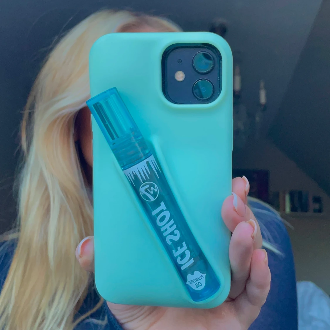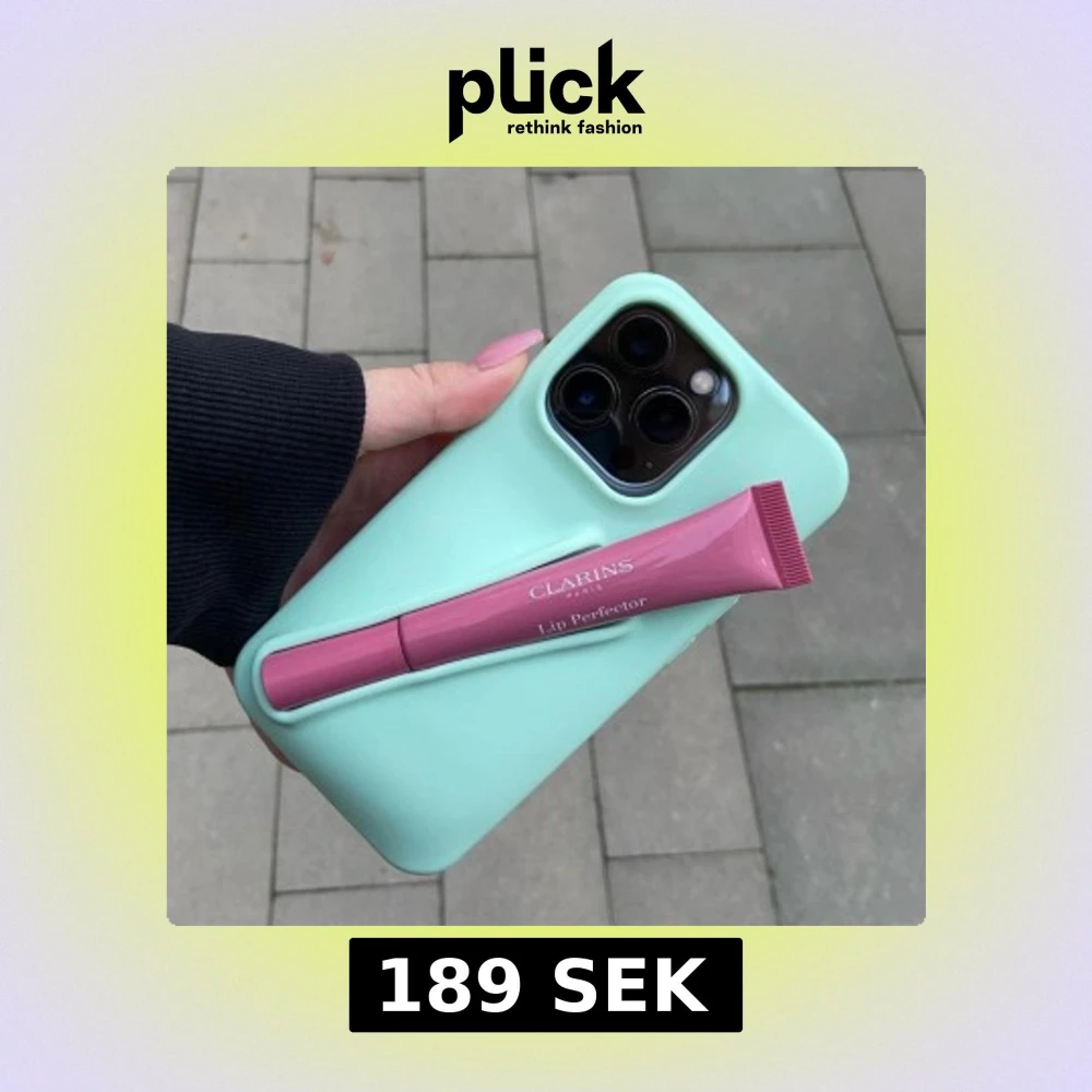 Mobilskal med en hållare för läppglans eller andra skönhetsprodukter. Skalet är i färgen mintgrön till iPhone 13/14/15💓 Skalet rymmer flera olika sorters läpprodukter och ger ett bra skydd till mobilen🥰