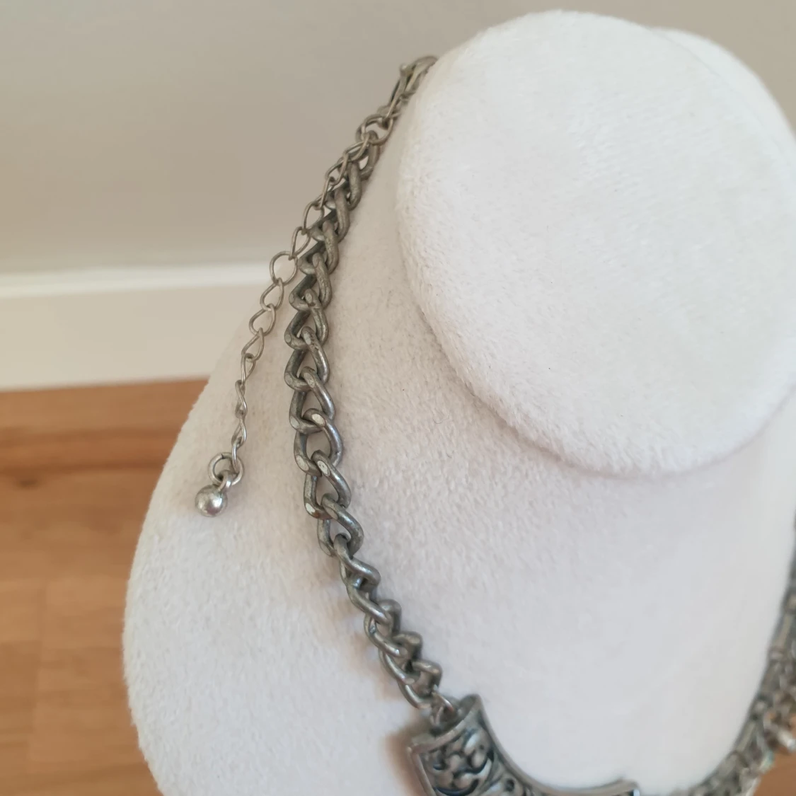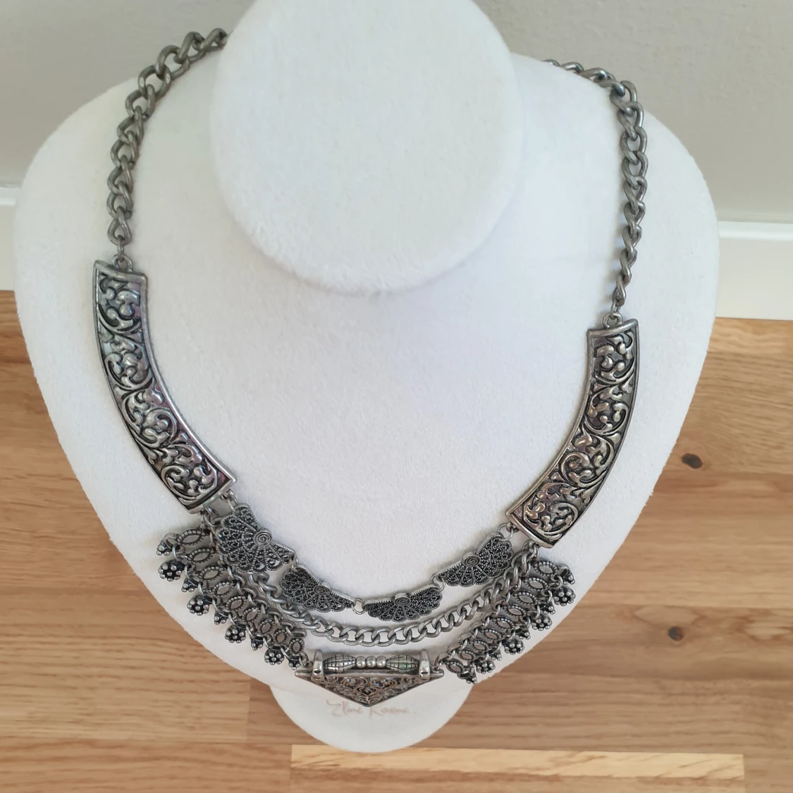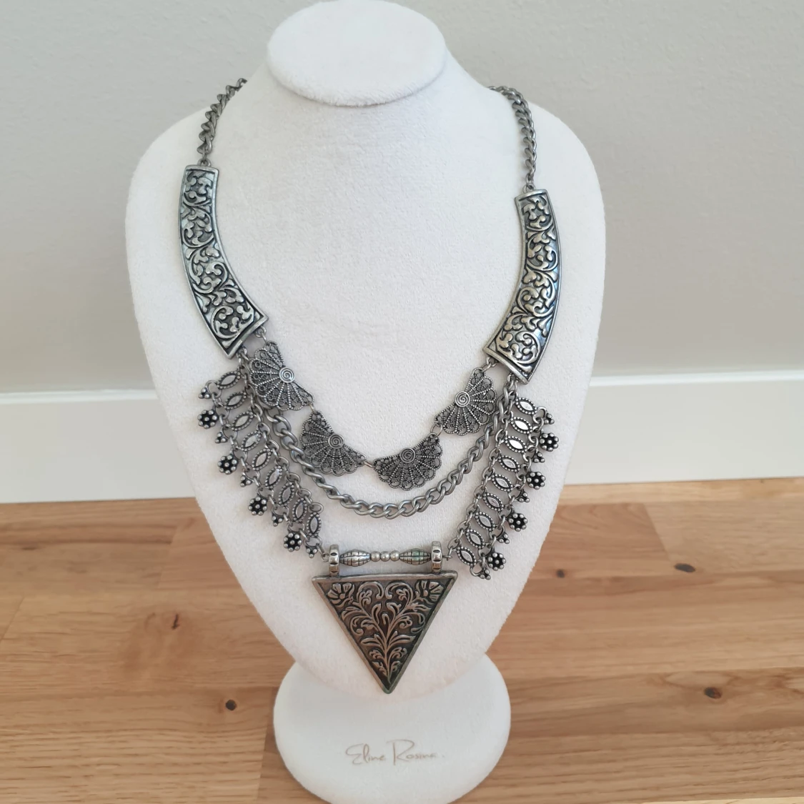 Unikt antikt silverfärgat halsband med detaljerade mönster och flera lager av kedjor. Halsbandet har intrikata blommönster och en stor triangulär hängande del. Perfekt för att ge en bohemisk touch till din outfit.