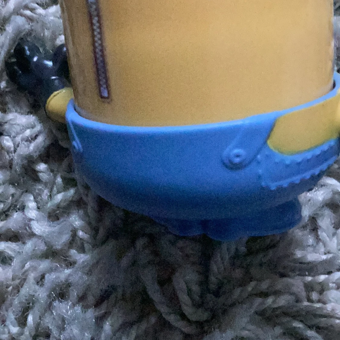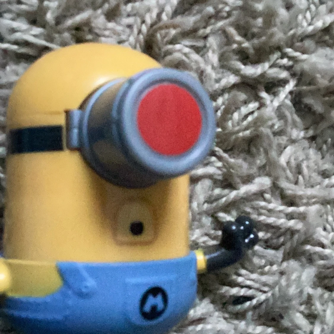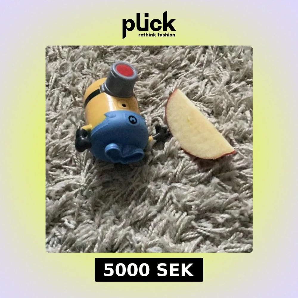 En liten Minion-figur med blå overall och en stor röd knapp på framsidan. Figuren har svarta handskar och skor, samt en grå detalj runt ögat. Perfekt för fans av de populära filmerna följer med äpple samskigt mums mums mums aah!!!