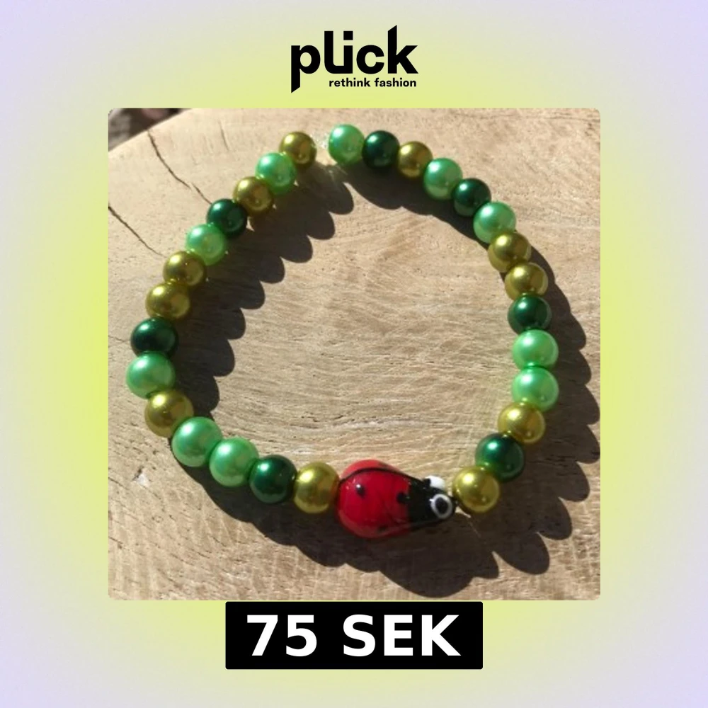 Vackert armband av gröna glaspärlor och en nyckelpiga 🐞🌿