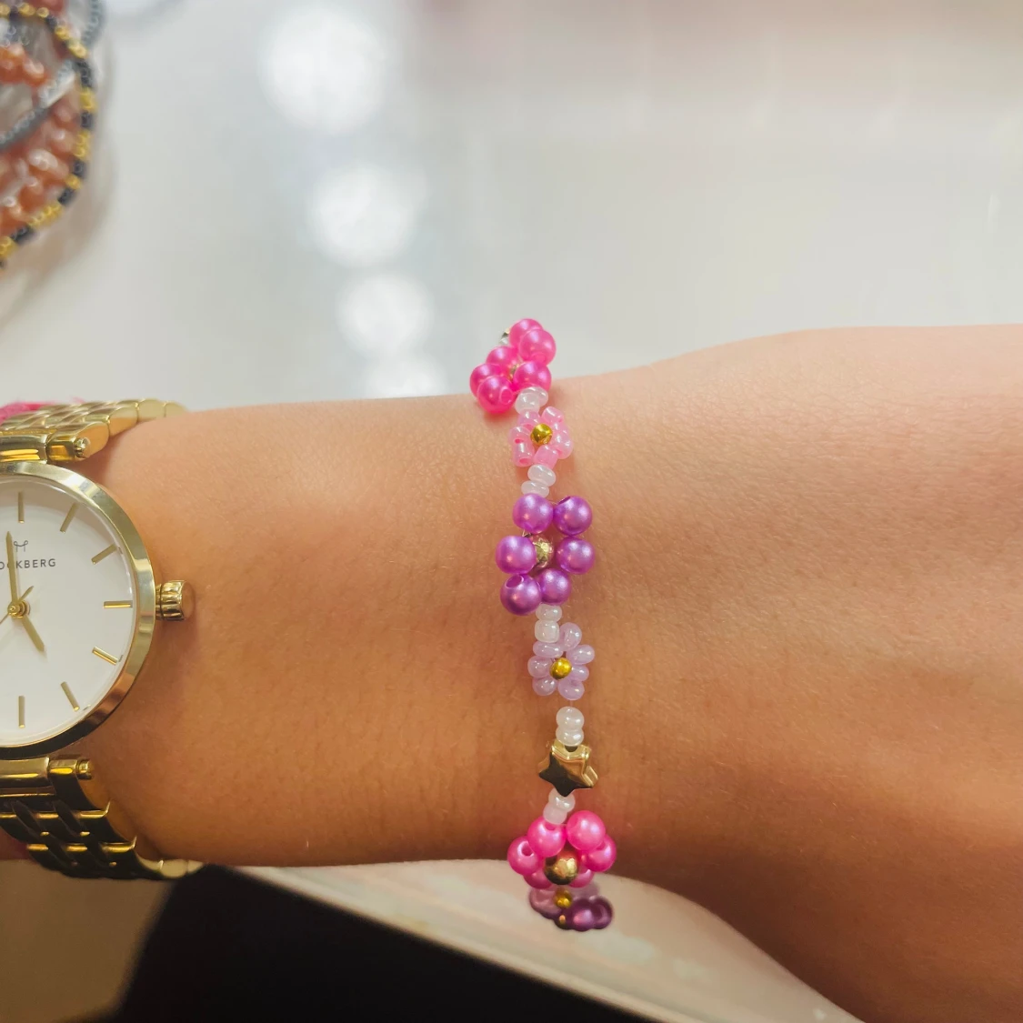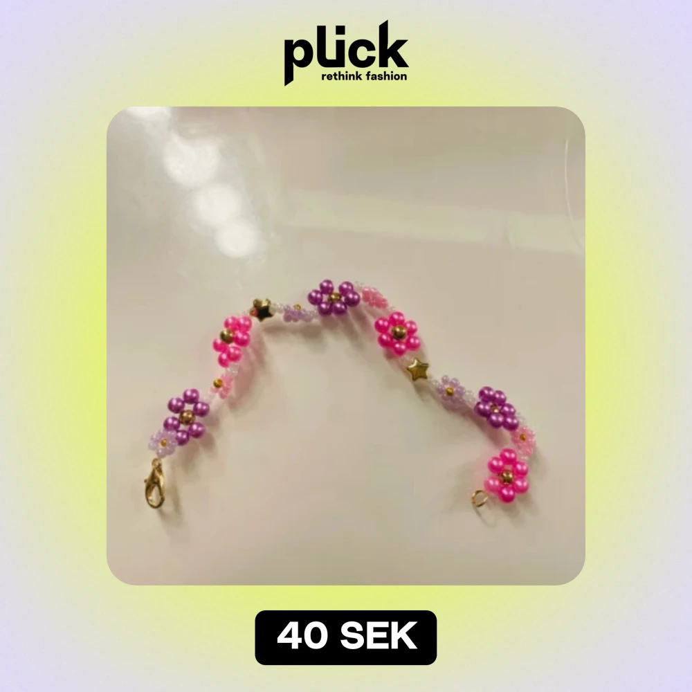 ett sååå sjukt fint och somrigt armband med rosa och lila blommor💜🩷
