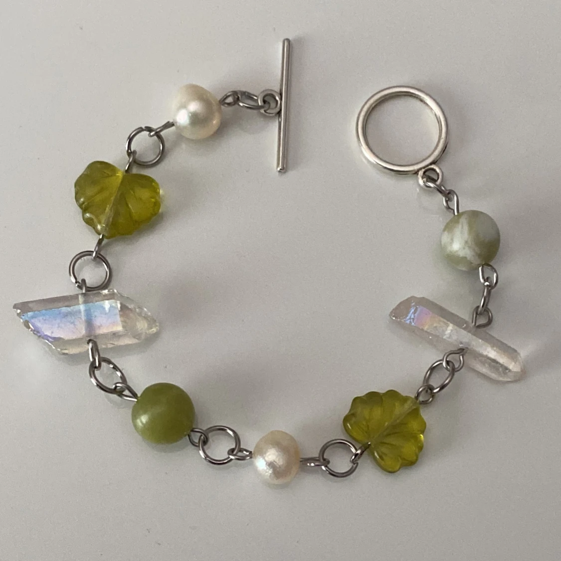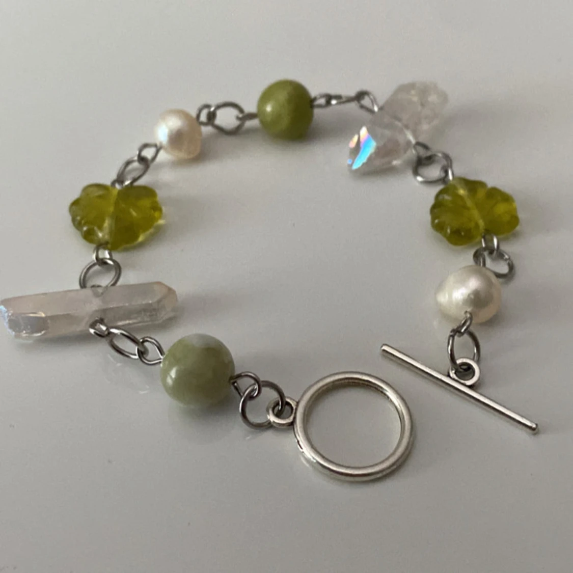Handgjort armband med kvarts, upcycled sötvattenpärlor & tjeckiska glaspärlor🍀🐚