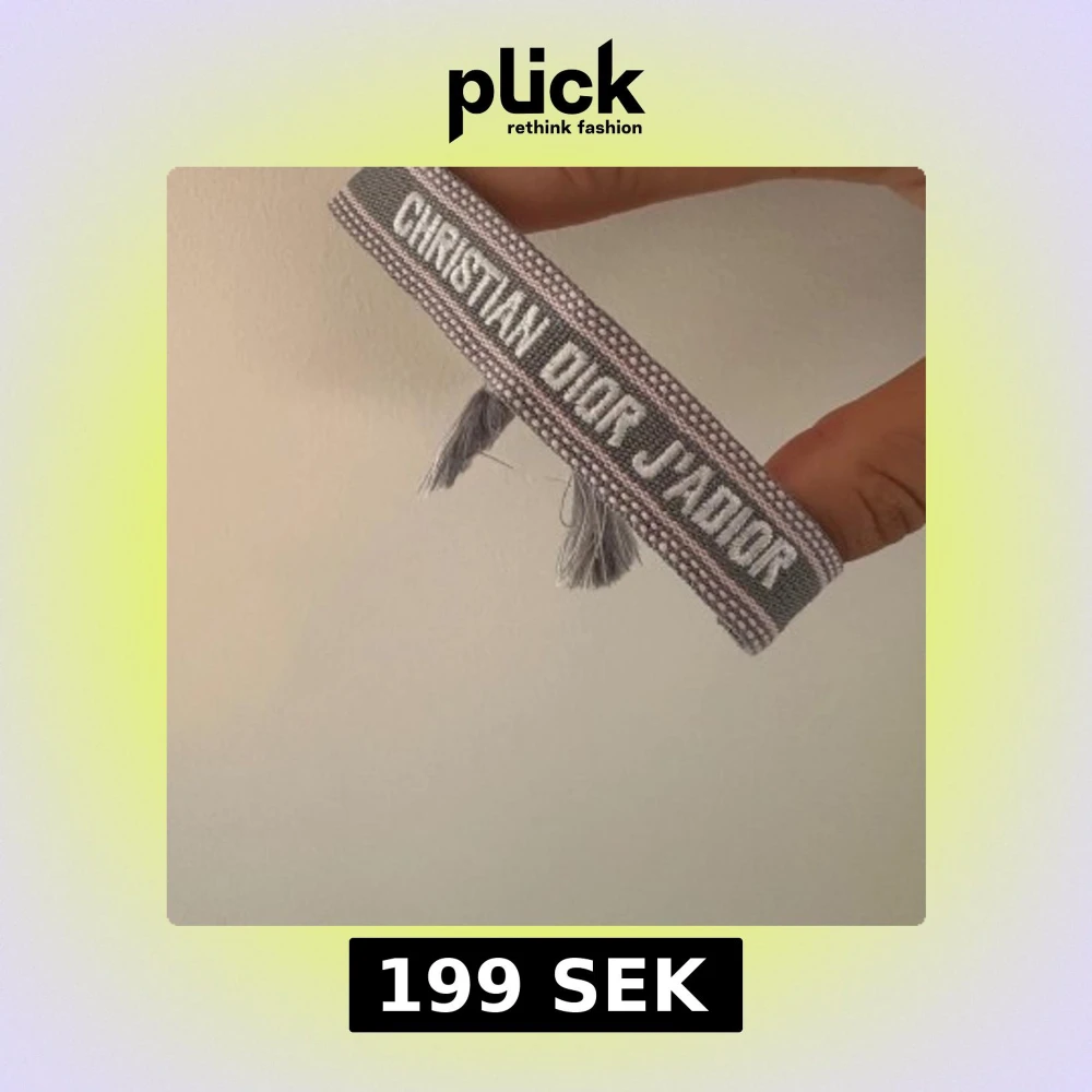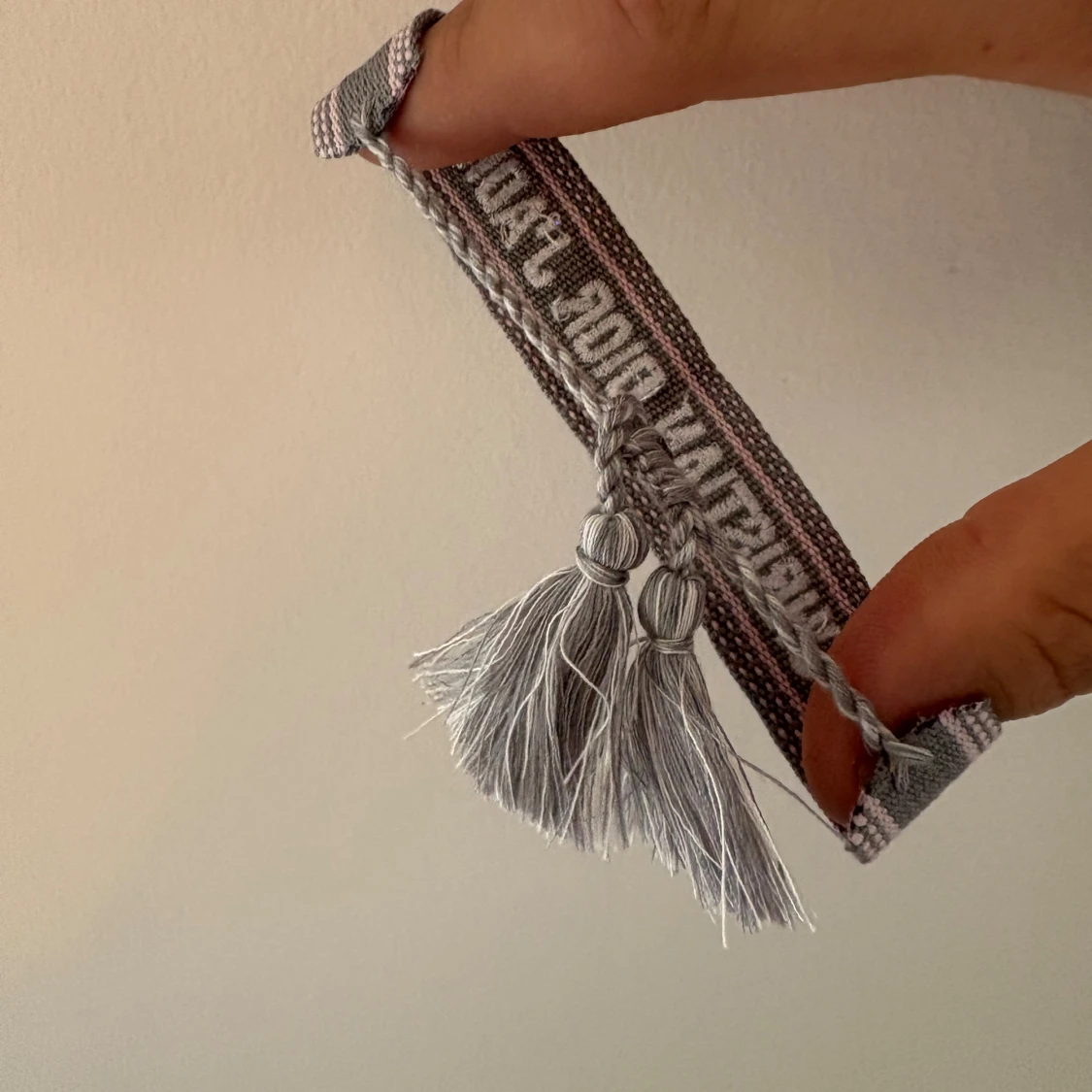 Snyggt vävt armband med texten 'J'Adior' i vitt. Armbandet är grått med rosa detaljer och har justerbara tofsar i ändarna. Perfekt accessoar för att lyfta din outfit med en exklusiv touch.