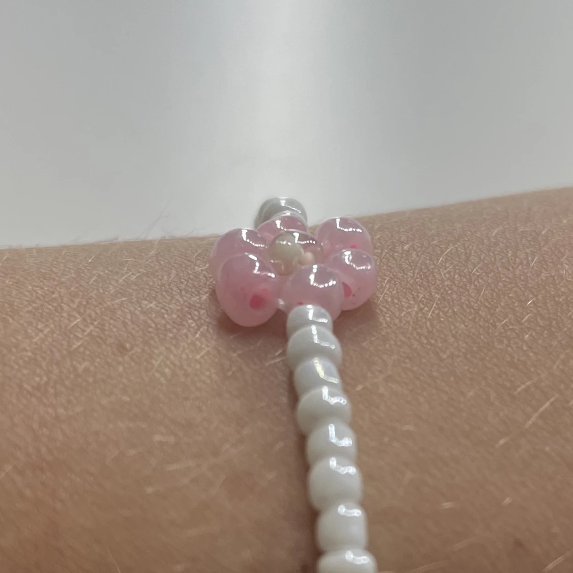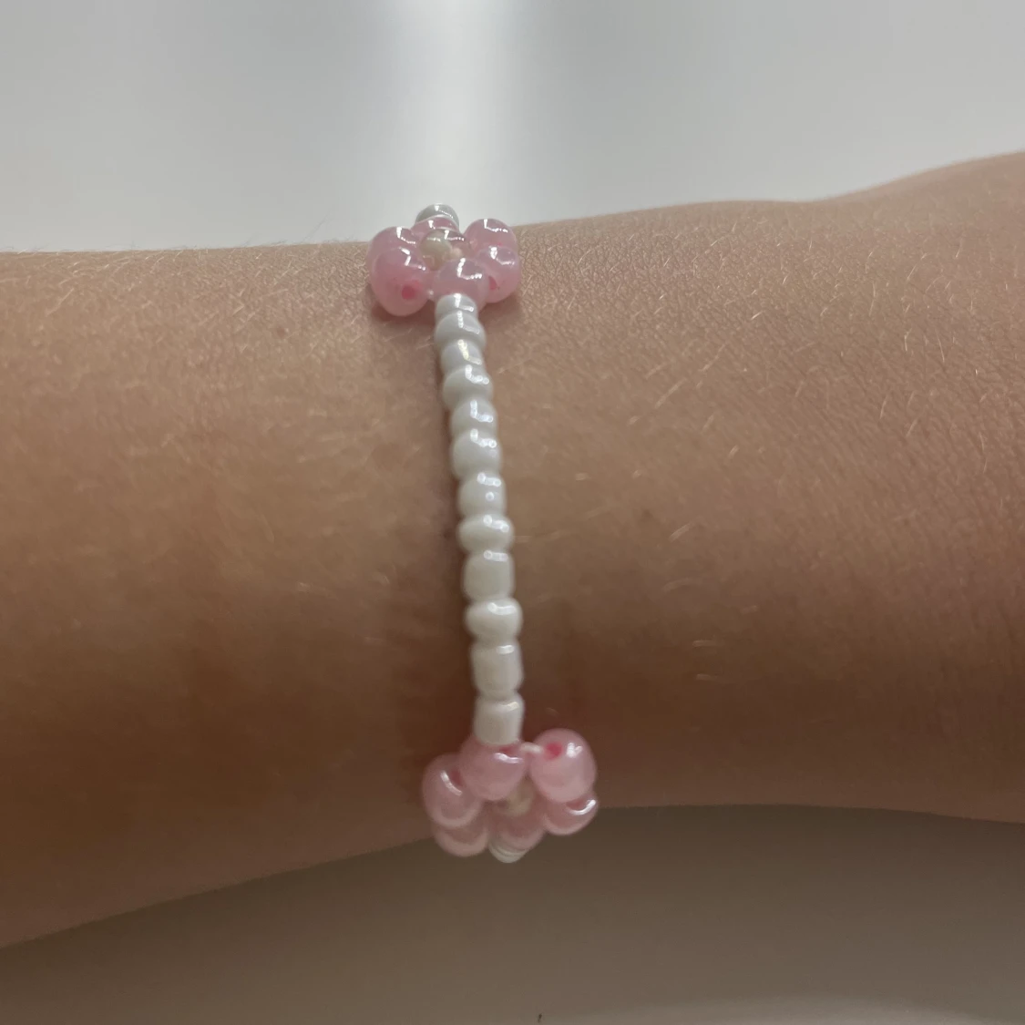 Ett vitt och rosa pärlarmband med blommor på i storlek s/m men kan göras i fler storlekar om man vill ha, om de finns frågor är de bara att skriva! 🤍💕