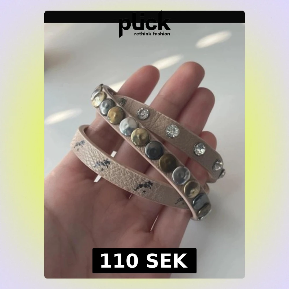 Säljer ett beige rosa armband med coola detaljer. Armbandet har både runda nitar i guld och silver samt glittrande stenar längs hela bandet. Det är designat för att vira flera varv runt handleden och har en snygg, lite rå känsla. Pris kan diskuteras