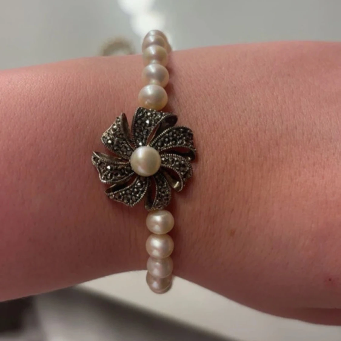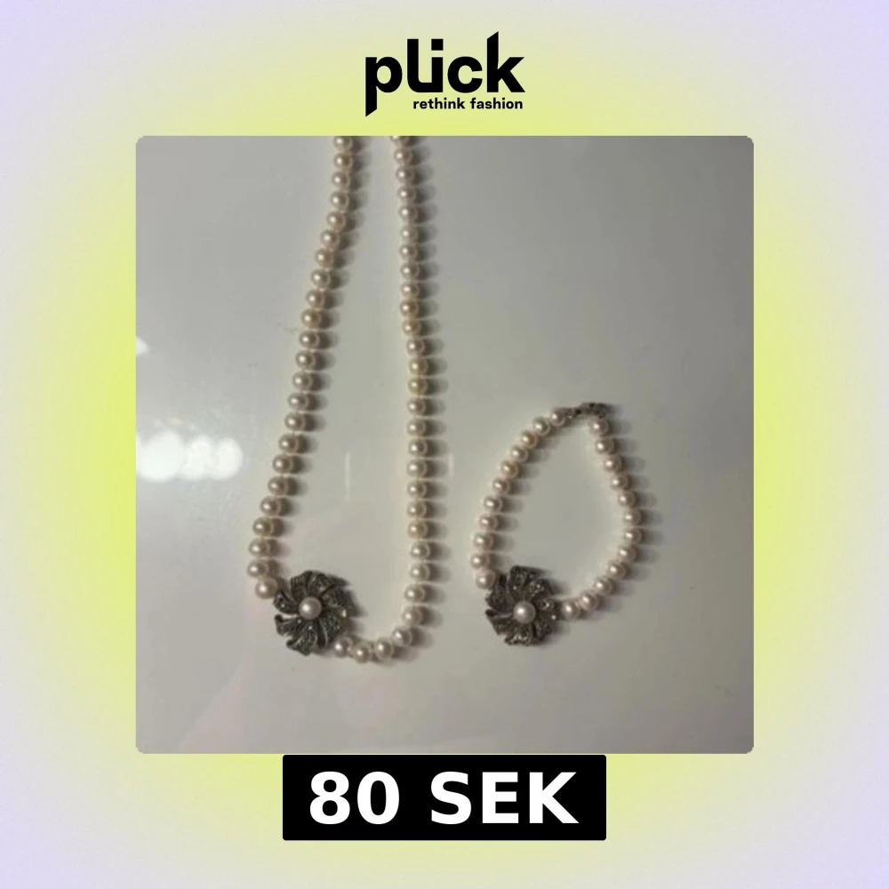 Säljer ett matchande set med halsband och armband av vita pärlor. Båda smyckena har en dekorativ blomformad detalj i silverfärg med en pärla i mitten. Perfekt för att ge en elegant touch till din outfit.