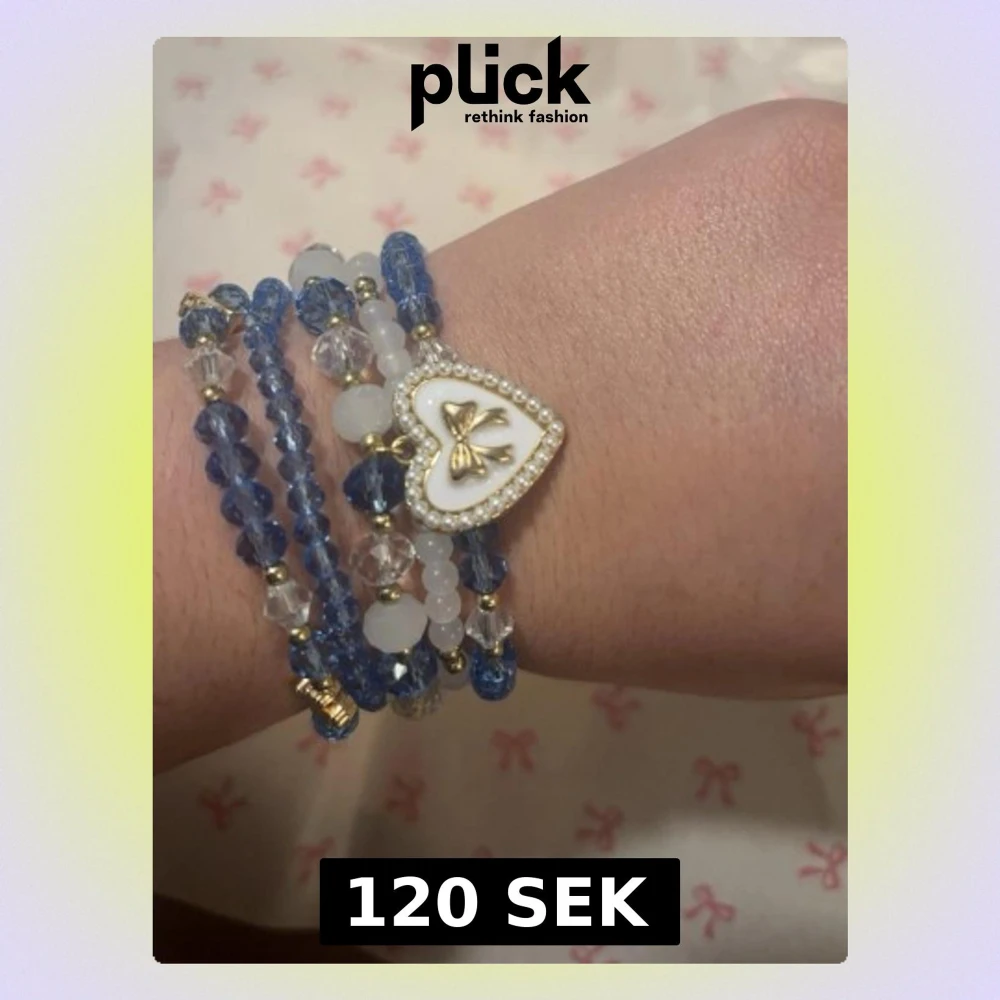 Säljer handgjorda armband med flera rader blå och vita pärlor, dekorerat med små guldfärgade detaljer. Armbandet har ett hjärthänge i vitt med pärlkant och en söt rosett i guld. Perfekt för dig som gillar unika accessoarer med lite extra bling.