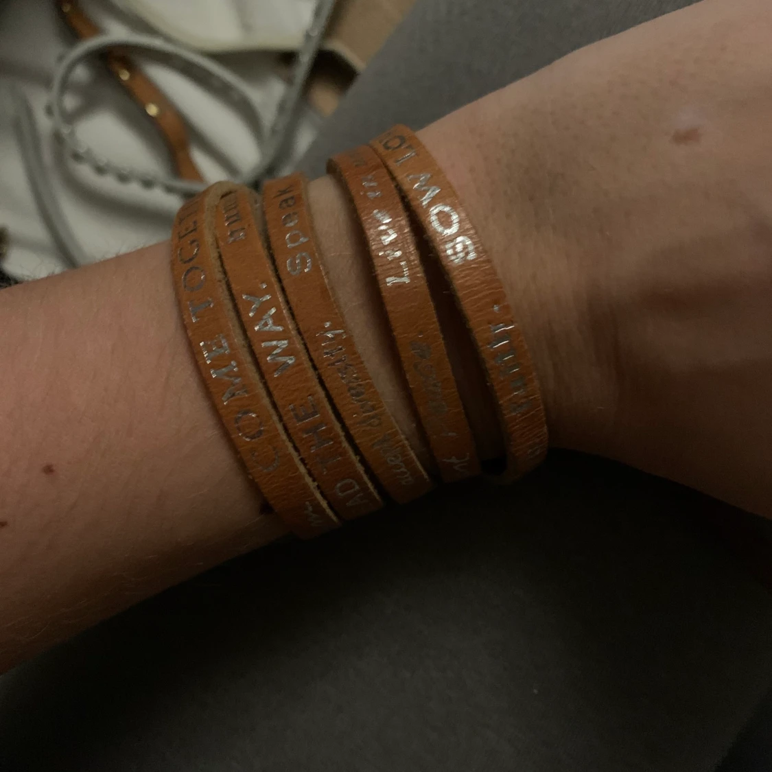brunt läder armband med silver text