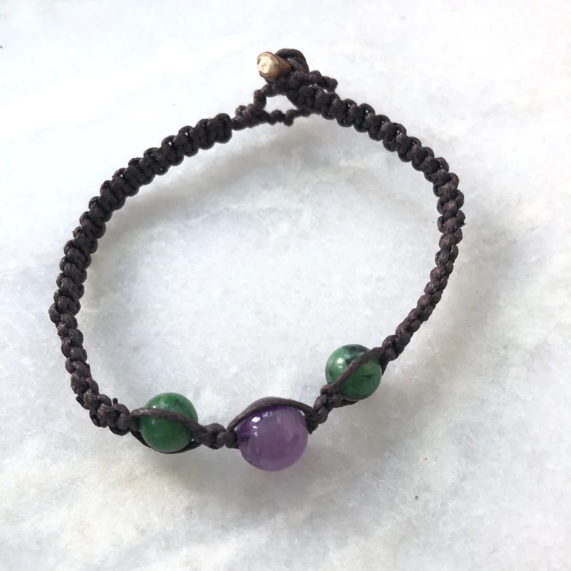 Handgjort makramé armband gjort av brun vaxad bomullstråd, Ametist och Zoisit. Alla kristaller jag säljer är äkta. ( 20 cm ) Frakt: 12kr 🦋