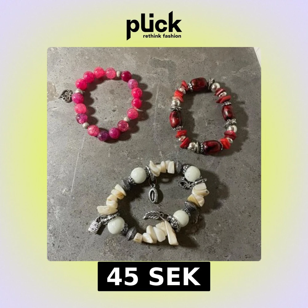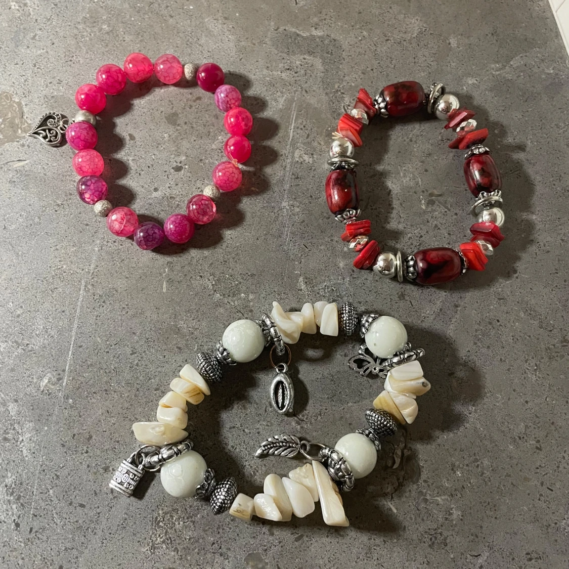 Säljer tre armband: ett med rosa/lila pärlor och hjärtberlock, ett med röda stenar och silverdetaljer, samt ett med vita pärlor, snäckor och flera små berlocker i silverfärg. 1 för 45 alla för 110kr men pris går att diskutera🙏