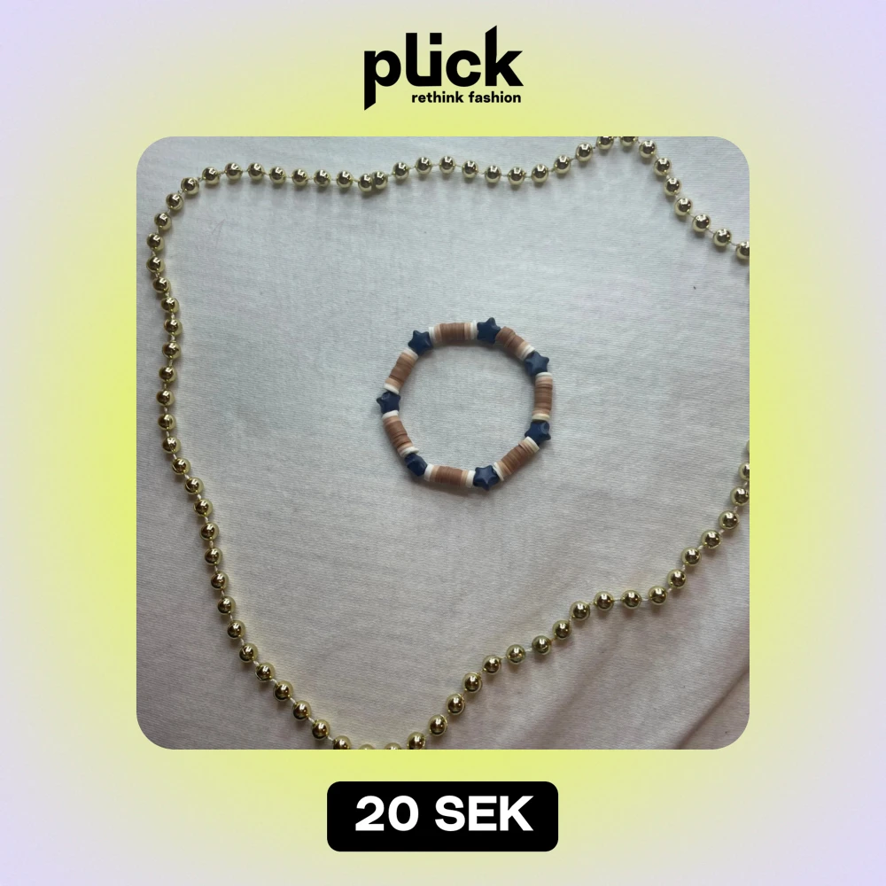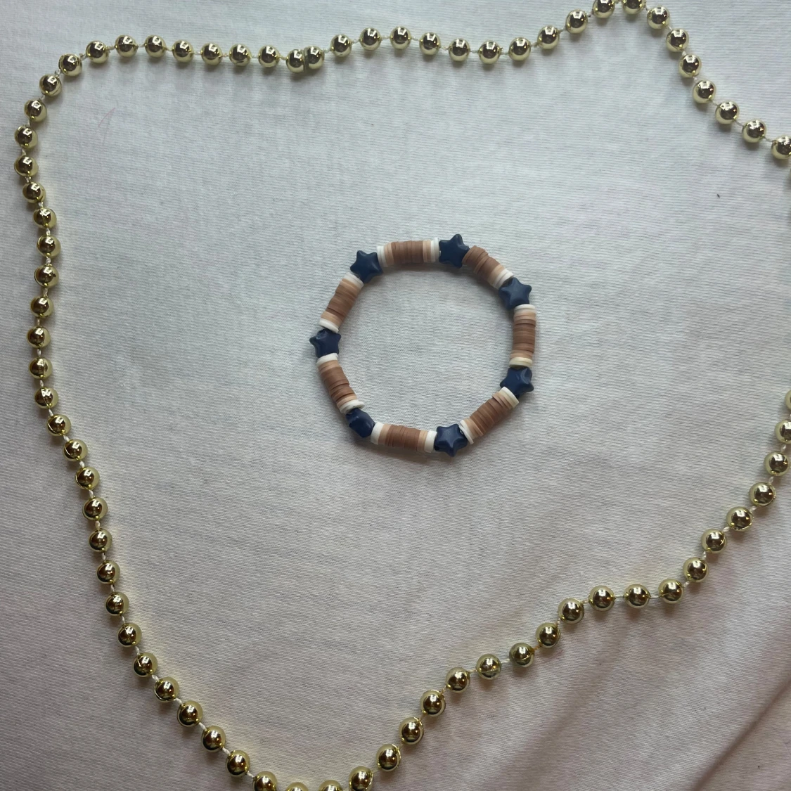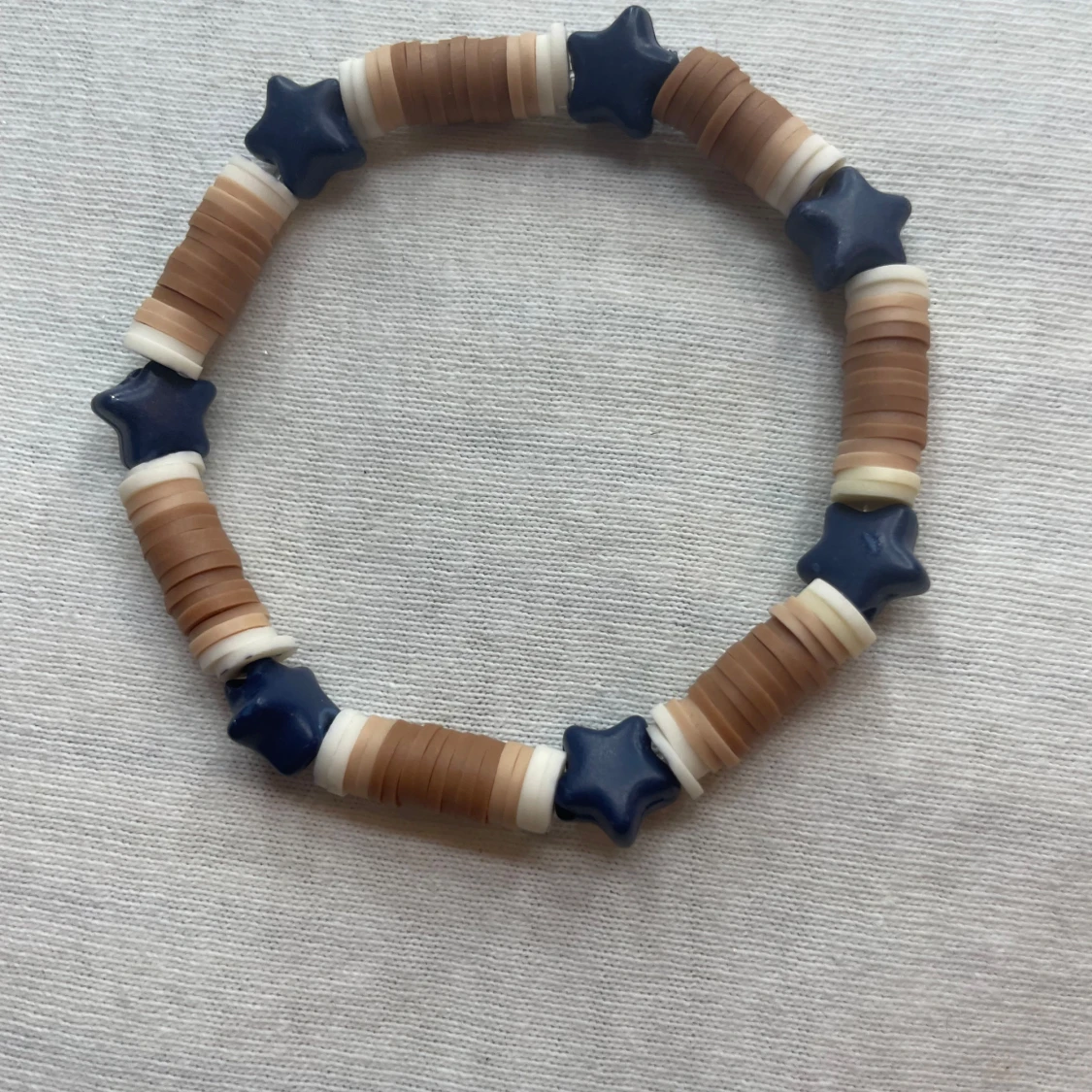 Säljer ett coolt armband med blå stjärnor och beige, vita pärlor. Perfekt för att ge en bohemisk touch till din outfit.smycket är i mycket bra skick och kan bäras till både vardag och fest.