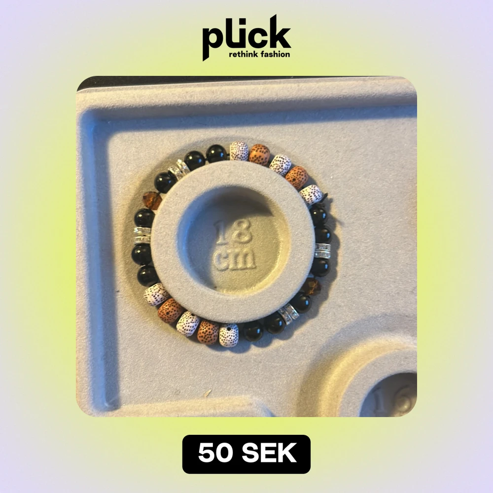 Snyggt armband med en mix av svarta, bruna och vita pärlor. De bruna pärlorna har ett prickigt mönster och de svarta är glansiga. Mellan pärlorna finns silverfärgade detaljer som ger en extra touch. Perfekt för både vardag och fest!