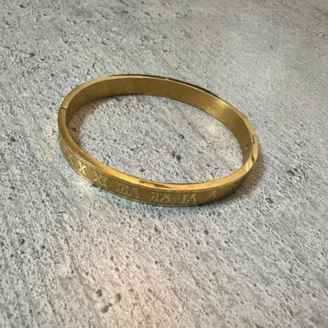 Coolt armband i guldfärg med ingraverade romerska siffror runt hela bandet. Stilren och tidlös design som ger en lyxig känsla till din outfit. Perfekt accessoar för dig som gillar detaljer med en twist. Steinless steel som tappar aldrig färg