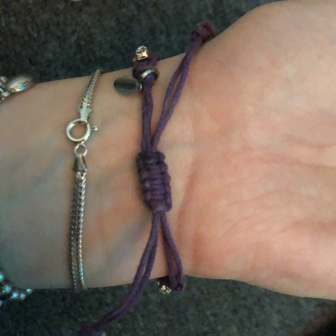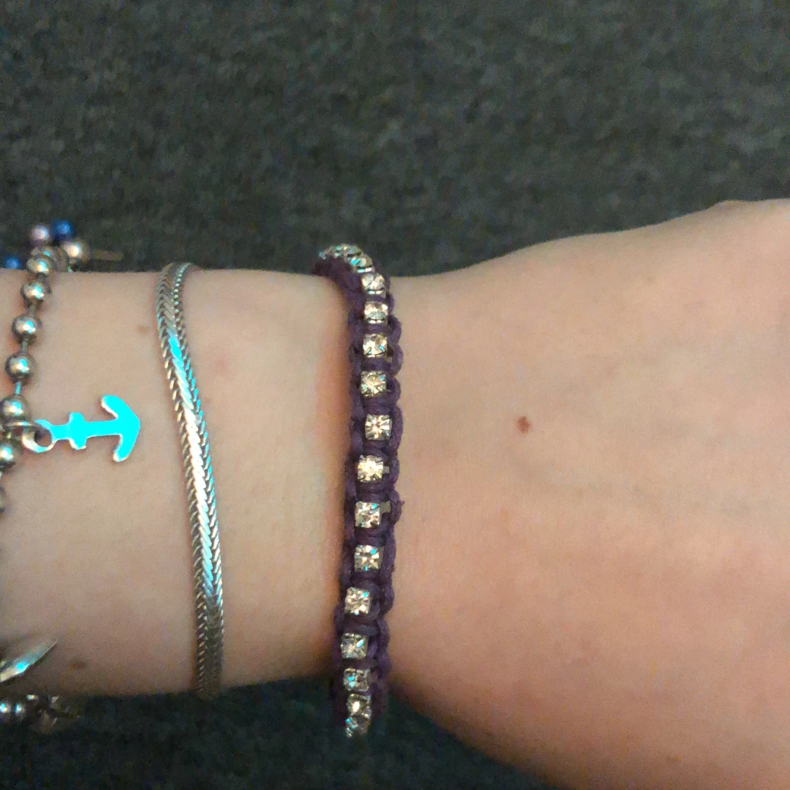 Lila armband med silvriga stenar på,man kan Justera hur man vill att den ska sitta på handleden,Berling skrev via Swish,köp inte direkt🤍
