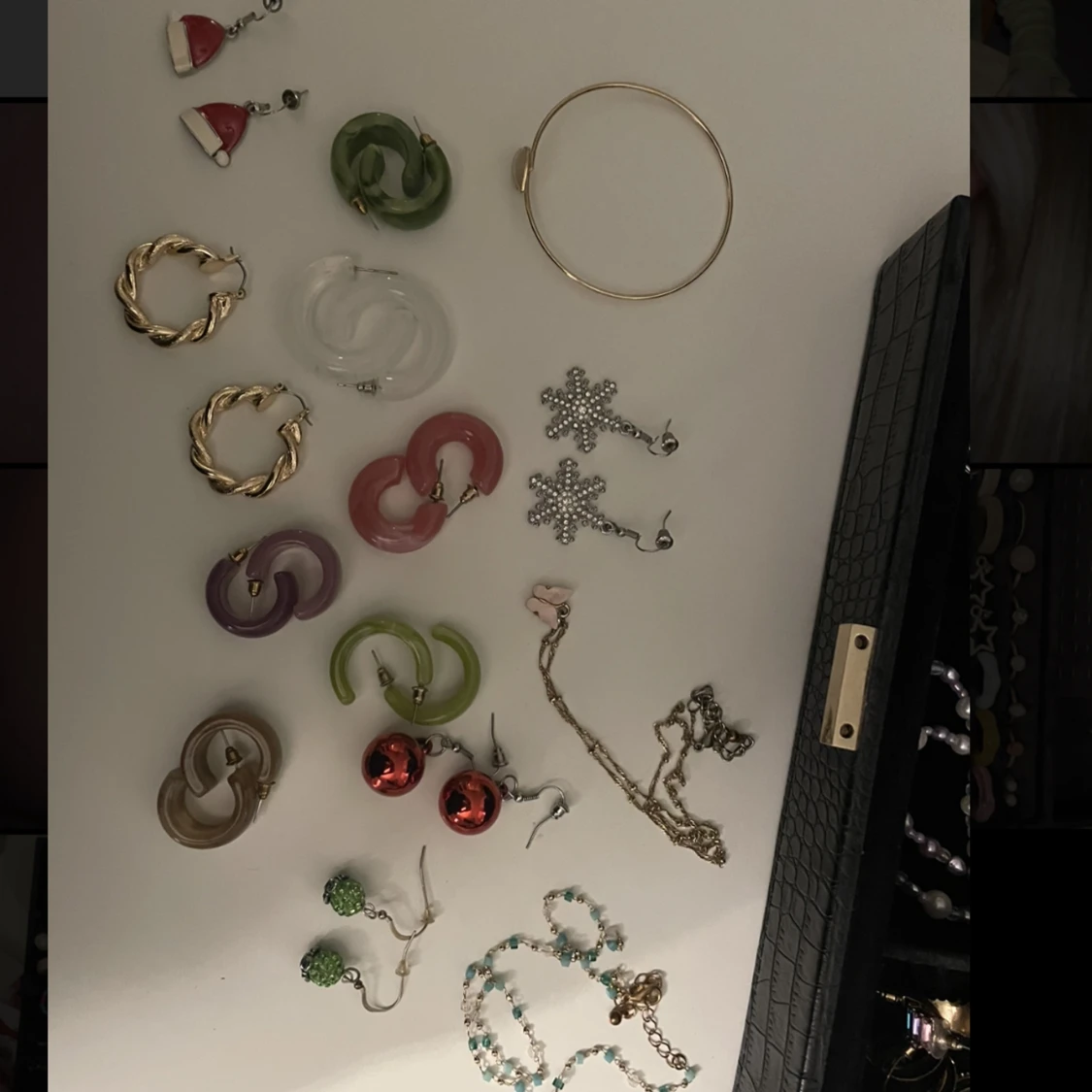 Alla smycken på bilden för 100 kr + frakt. Ett smycke/par kostar 10 kr. För det mesta örhängen, två halsband och ett armband