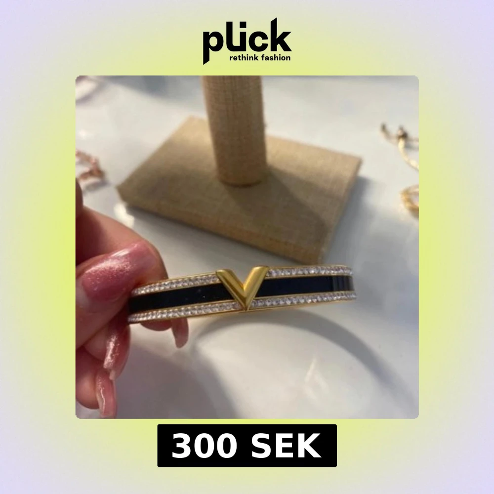 Elegant armband i guld med svart emalj och glittrande stenar. Designen har en distinkt V-formad detalj i mitten. Perfekt för att ge en lyxig touch till din stil.