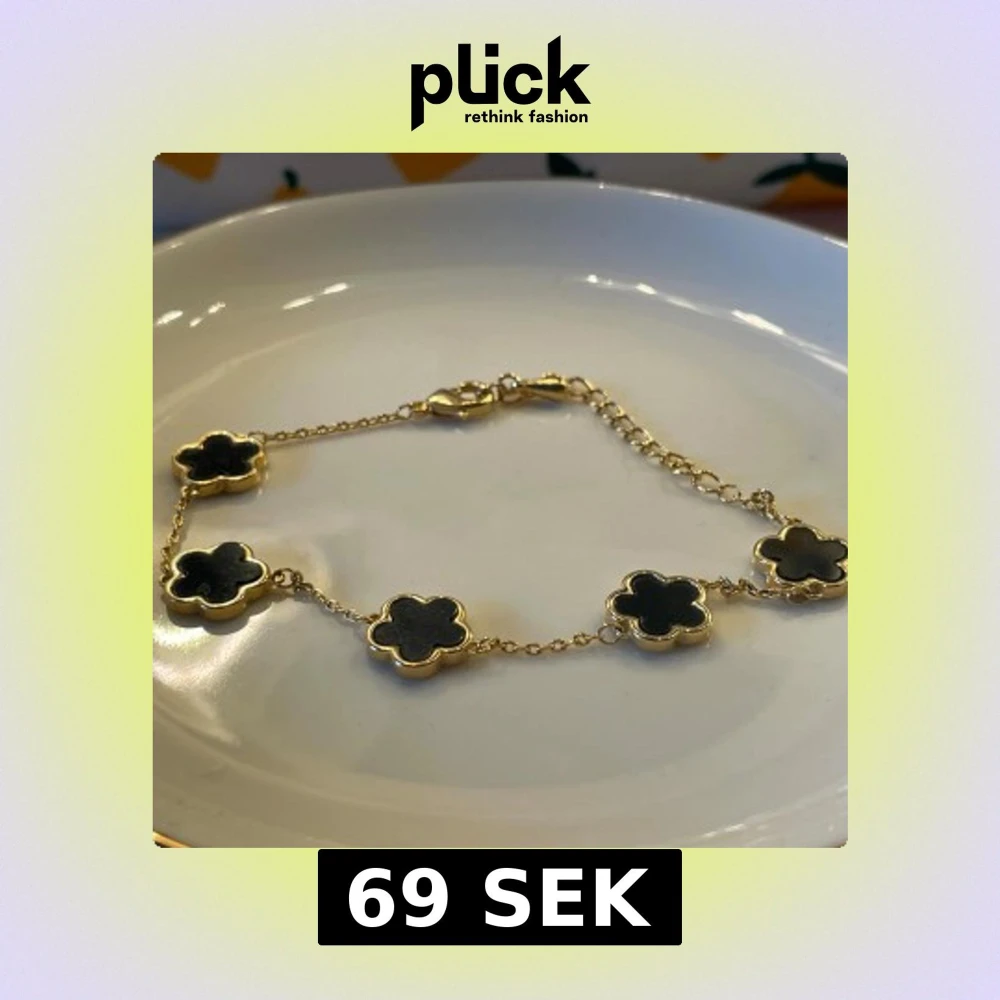 Snyggt armband med tunna guldfärgade länkar och fem svarta blommor i klöverform. Blommorna har en elegant inramning i guldton och armbandet stängs med ett klassiskt lås. Perfekt accessoar för att lyfta din outfit.