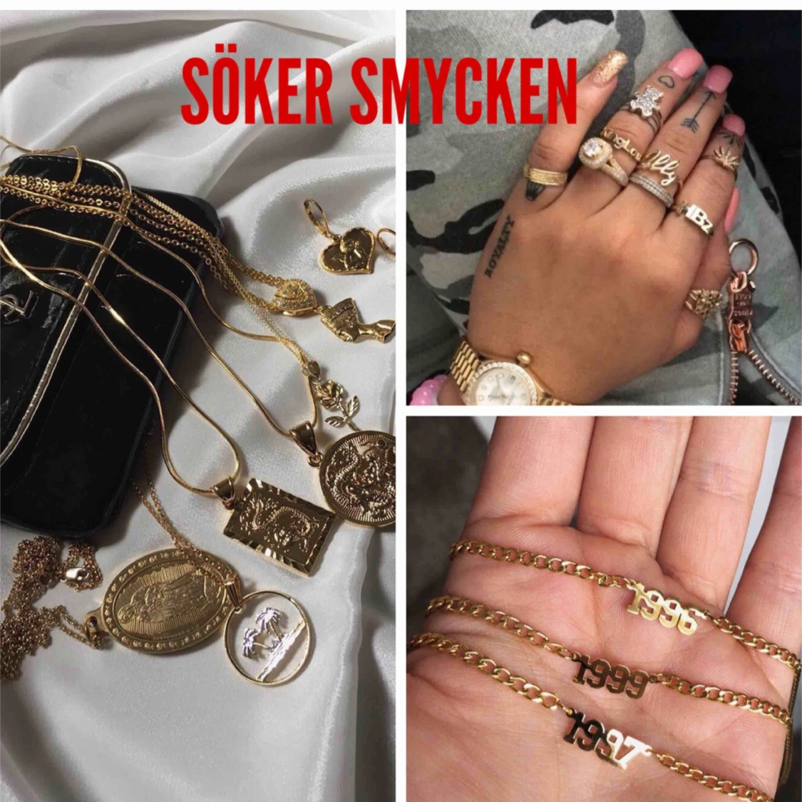 SÖKER smycken som är guldfärgade spelar ingen roll om dem är fake eller inte bara det är guldfärgat! Söker helst ringar och halsband!