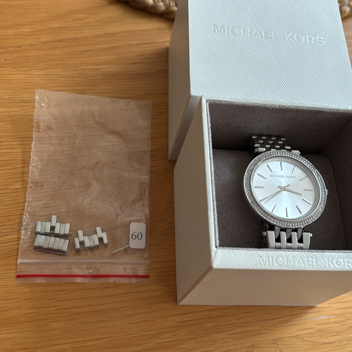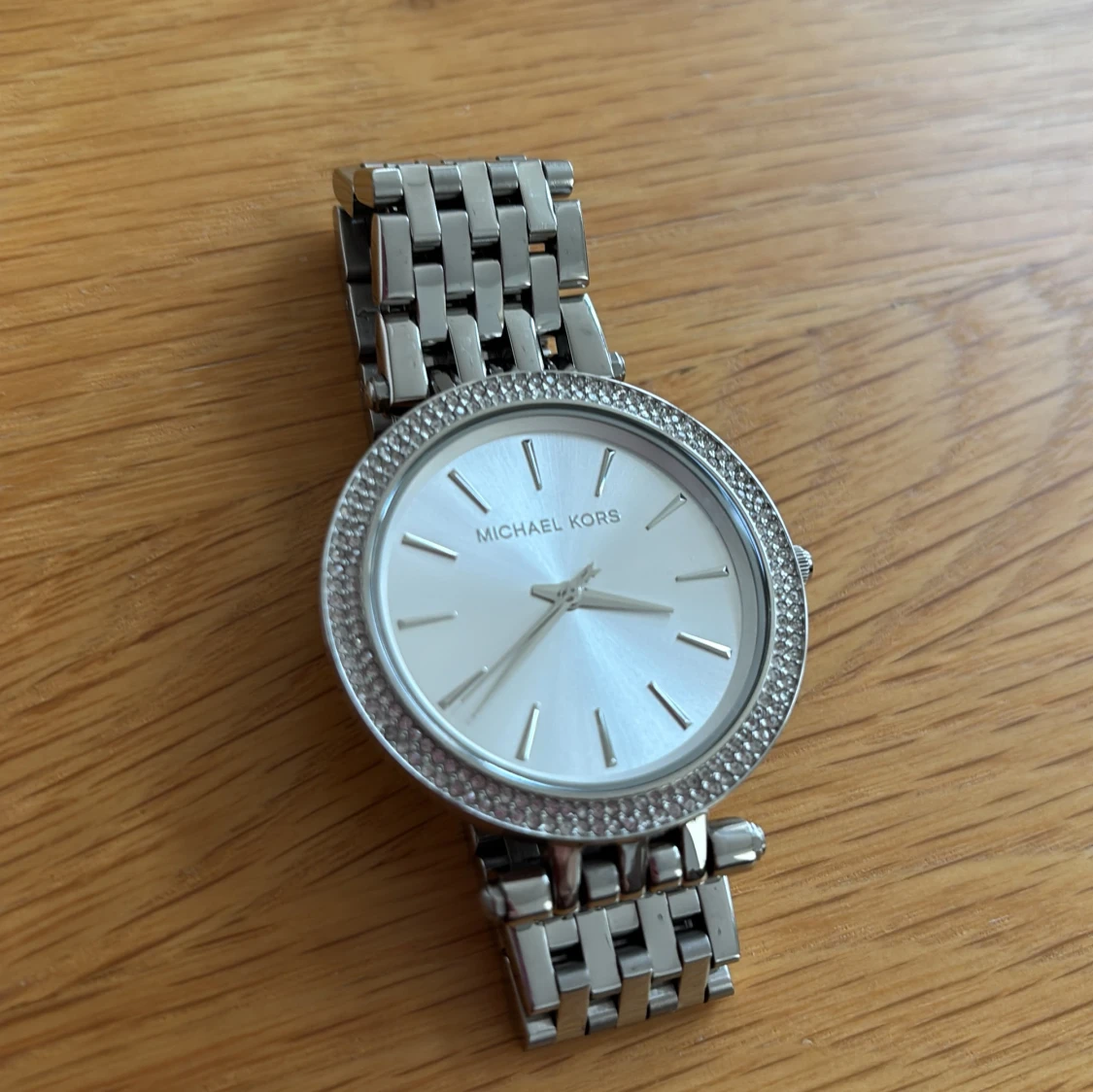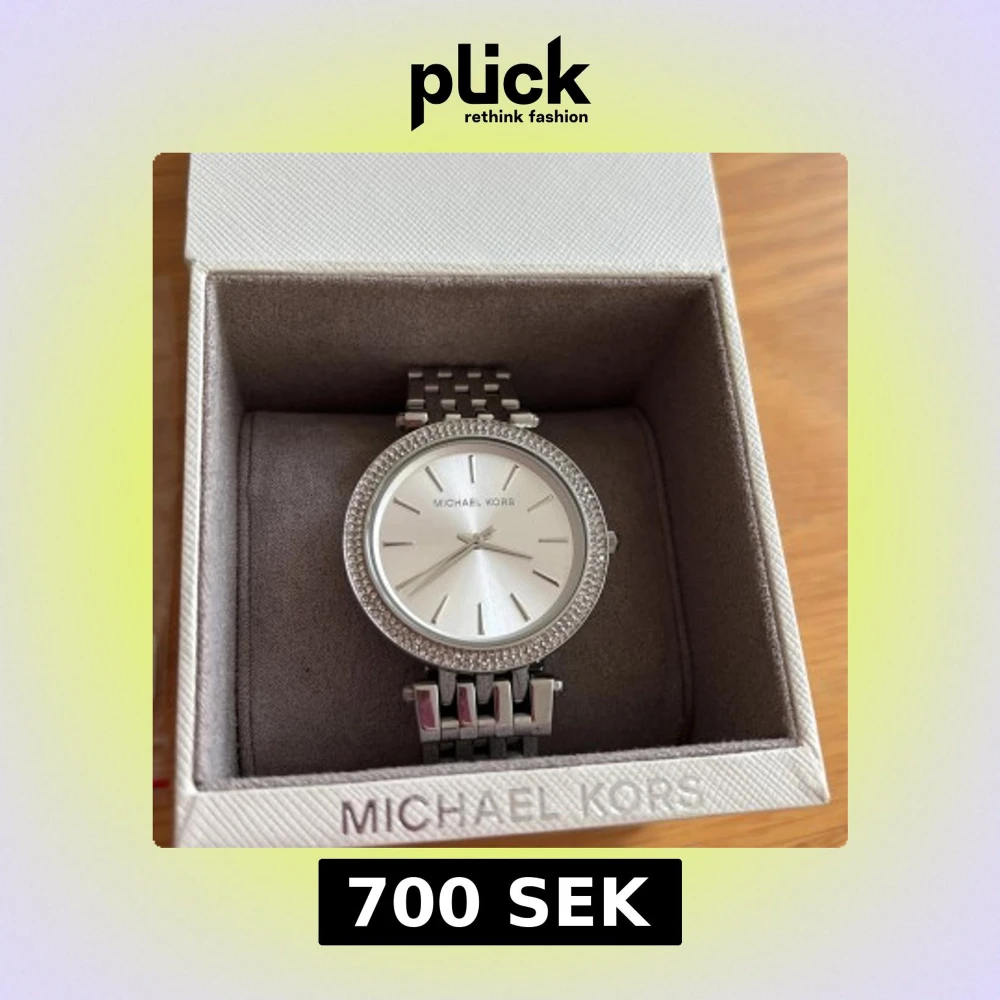 Stilren klocka från Michael Kors i silverfärg. Jag skickar med en länk till klockans armband så att man kan justera armbandets storlek runt handleden.