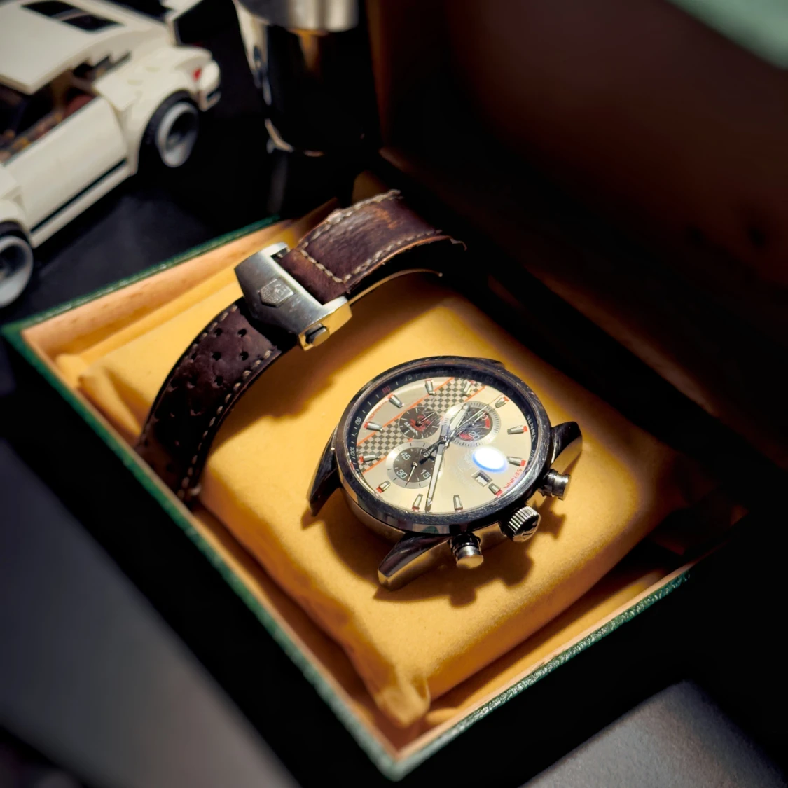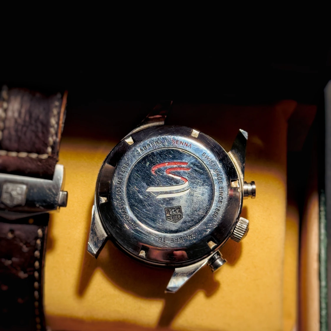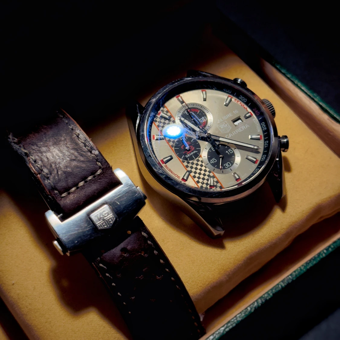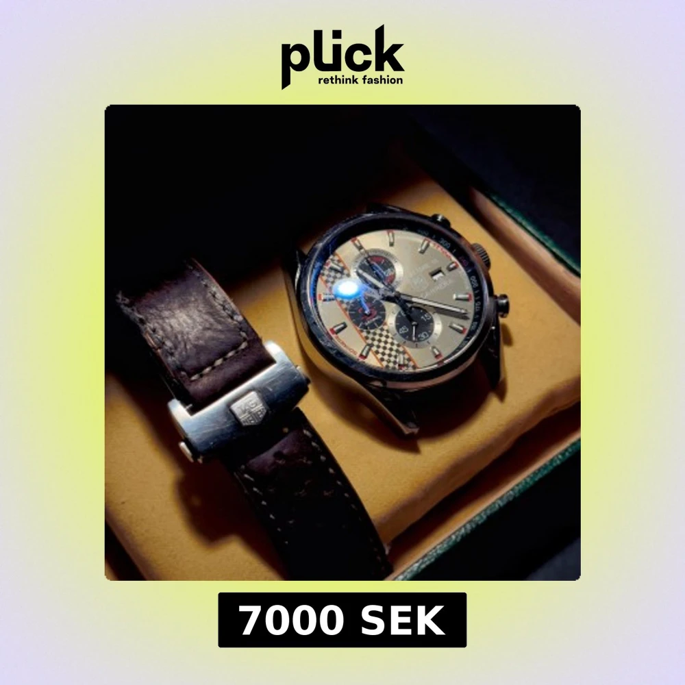 Säljer en TAG Heuer Carrera Senna kronograf med racinginspirerad urtavla i silver och svart, schackrutigt mönster och röda detaljer. Klockan har en robust boett i stål och ett brunt läderarmband med perforeringar och snyggt spänne med TAG Heuer-logga.