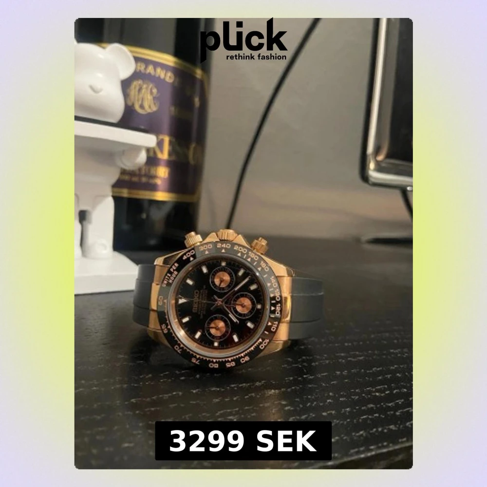 Säljer min Seiko Daytona Custom Mod kronografklocka med svart urtavla och guldiga detaljer. Klockan har tre subdials, svart bezel med vita siffror och en svart gummirem med guldfärgat spänne. Uret är 40 mm.
