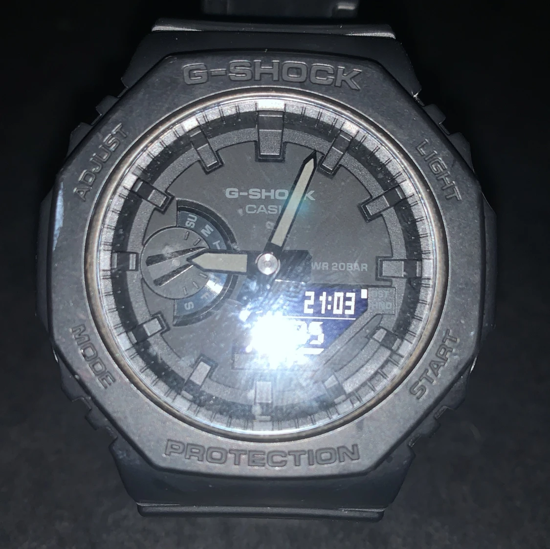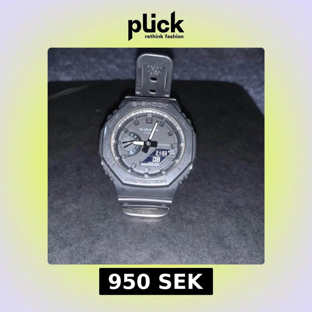 Säljer en svart Casio G-Shock klocka med både digital och analog display. Klockan har robust design, tydliga knappar runt boetten och en sportig känsla. Armbandet är i svart syntetmaterial och boetten är åttakantig. Perfekt för dig som gillar en tuff och modern stil.
