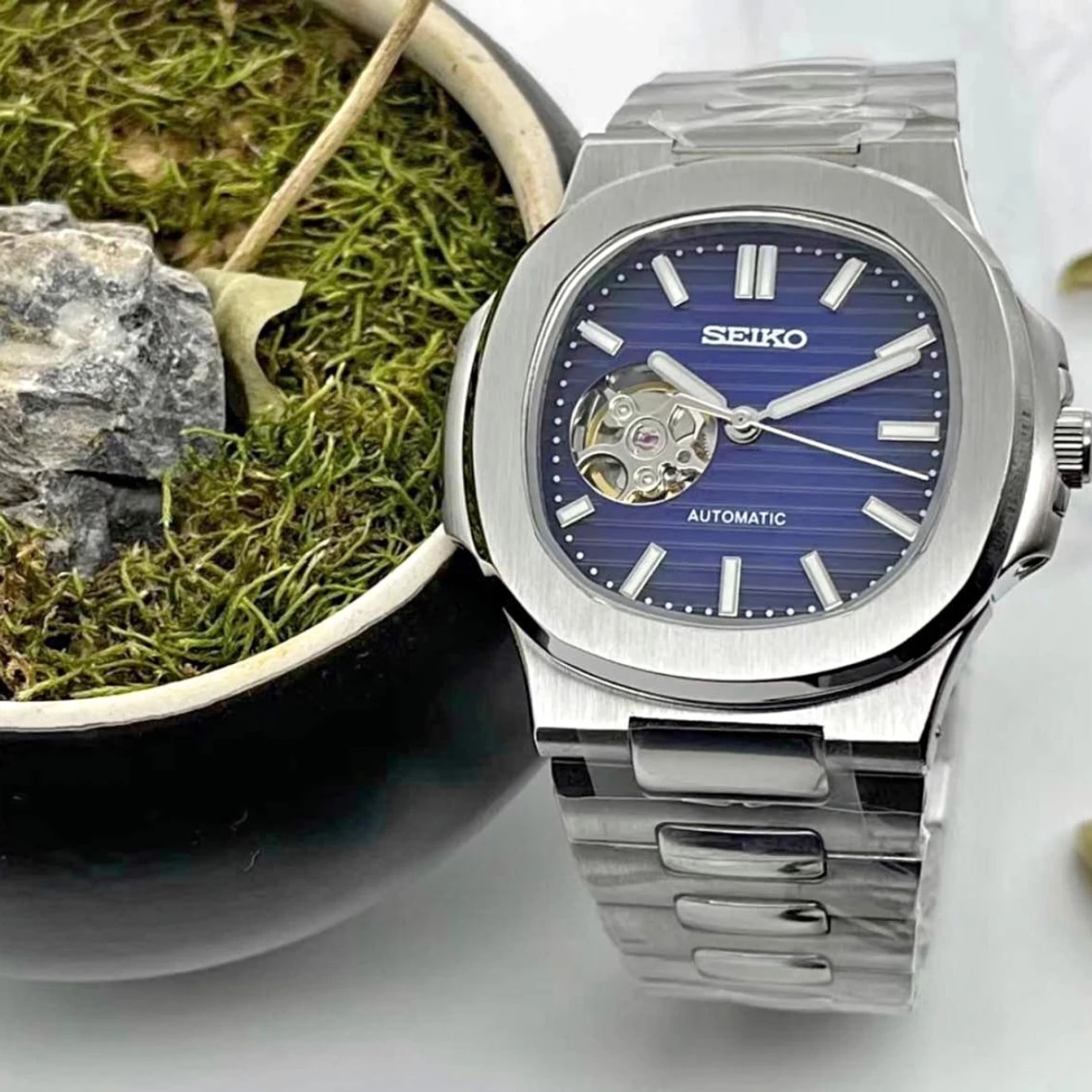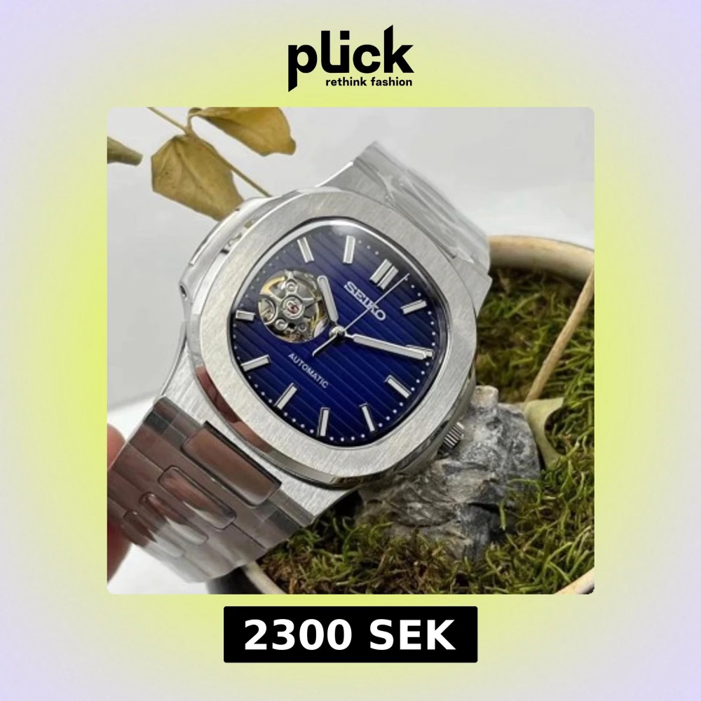 Snygg automatisk klocka från Seiko med en blå urtavla och silverfärgad boett. Klockan har ett öppet urverk som ger en cool inblick i mekaniken. Armbandet är i silverfärgat stål och ger en elegant touch. Perfekt för den som gillar stilrena accessoarer.