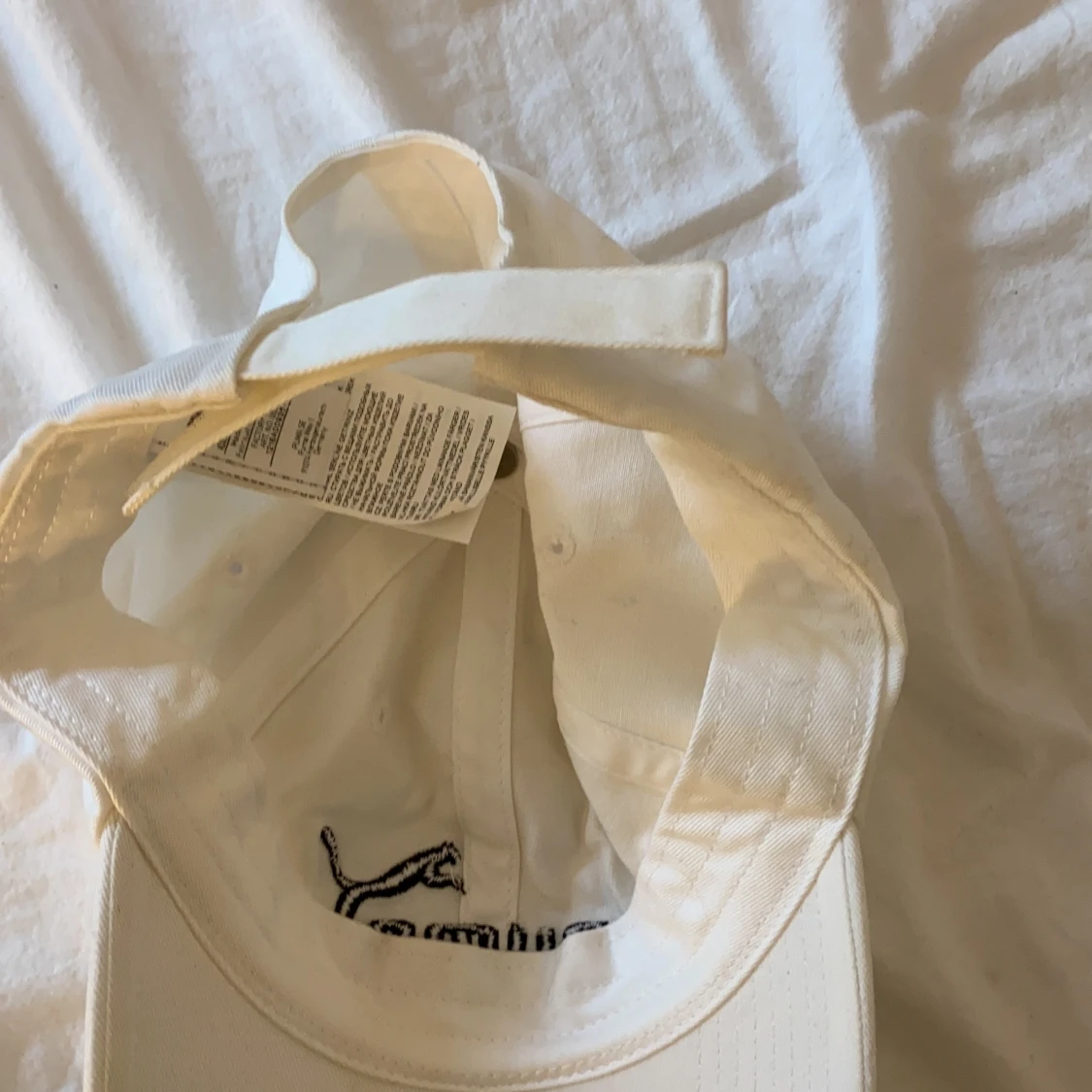 en nästa oanvänd vit puma keps! supersnygg och man kan ändra där bak. Storleken är ” adult” men skulle säga att den passar alla eftersom man kan ändra den!