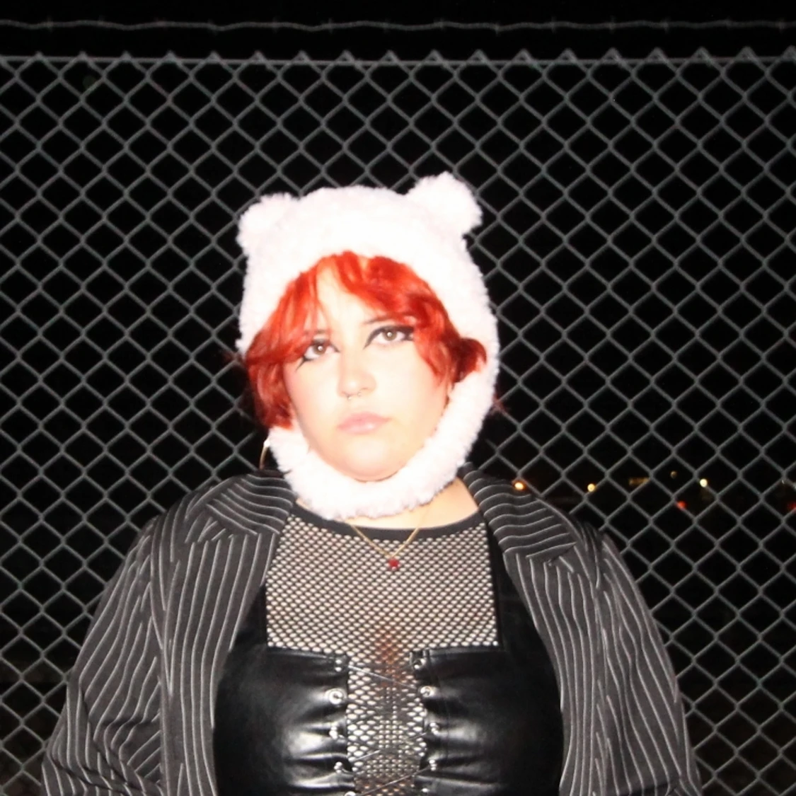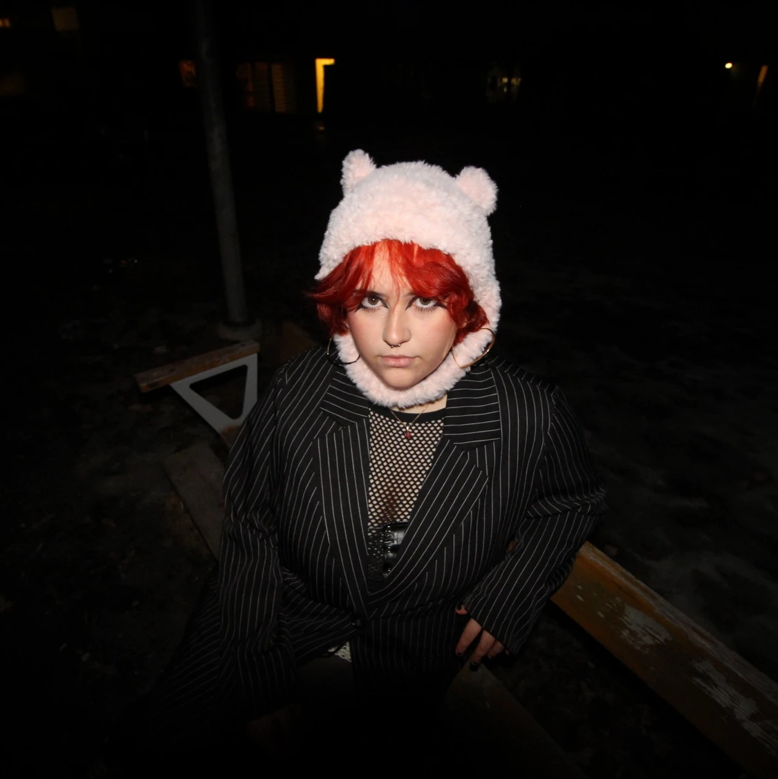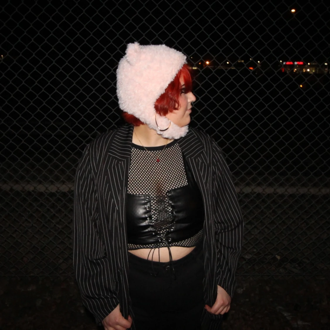 Virkad rosa mössa med öron och band under öronen. Virkat I fakefur garn. Bandet under hakan går att spänna loss men knapp.