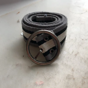 unikt vintagebälte i grått, vitt och svart tjockt tyg, fem hål och silverdetaljer. gissar på 80cm, passar någon i M bäst men jag i S har kunnat ha det