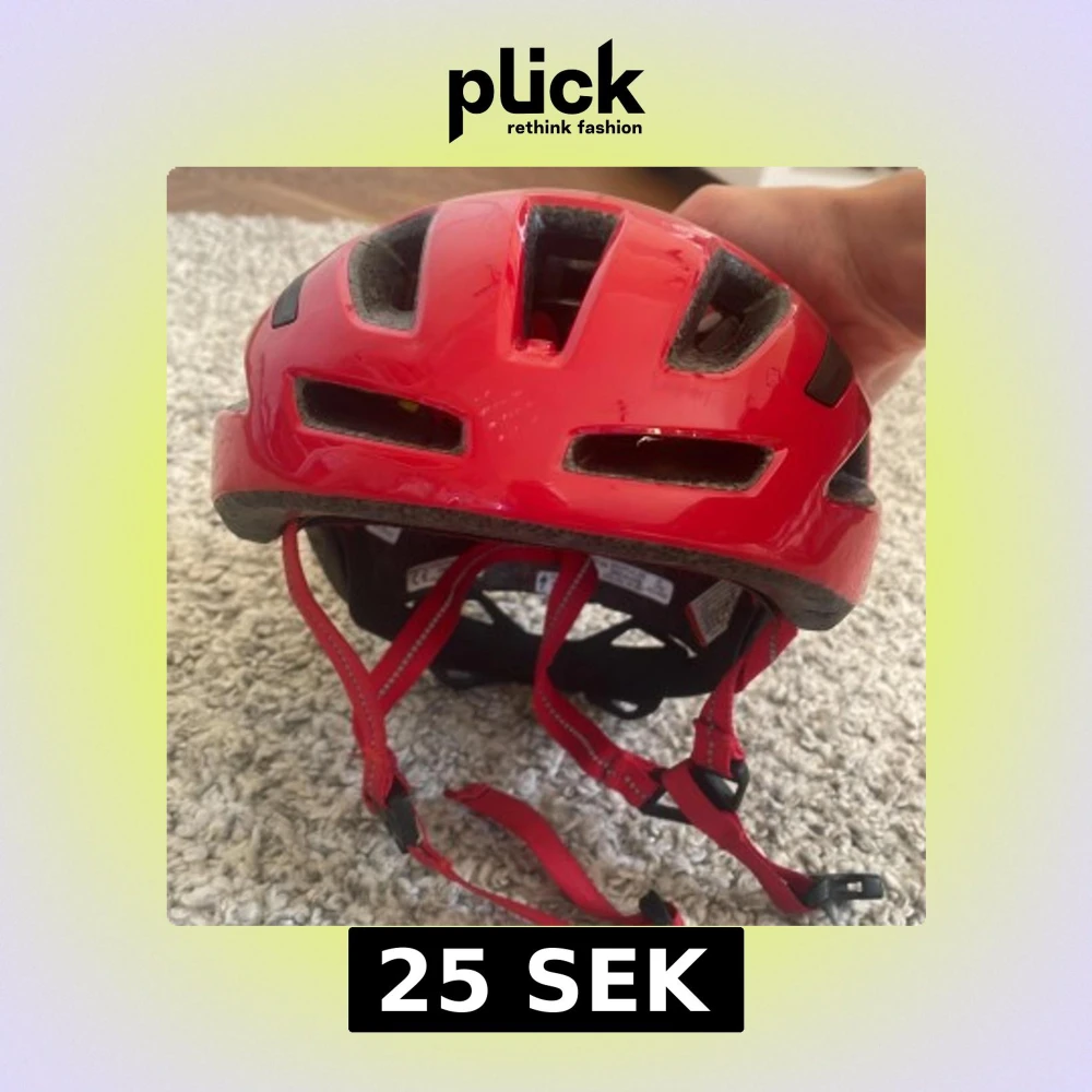 Säljer en snygg röd barn cykelhjälm från Specialized med flera ventilationshål och justerbart spänne. Hjälmen har MIPS-teknologi för extra säkerhet och cool design med svarta detaljer. Perfekt för dig som vill ha både stil och skydd när du cyklar.