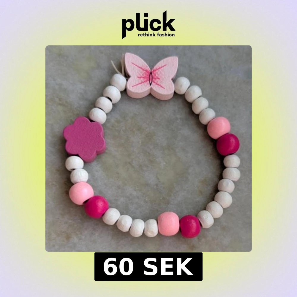 Charmigt armband med vita, rosa och cerise träpärlor. Dekorerat med en söt rosa fjäril och en cerise blomma. Perfekt för att lägga till en lekfull touch till din stil.