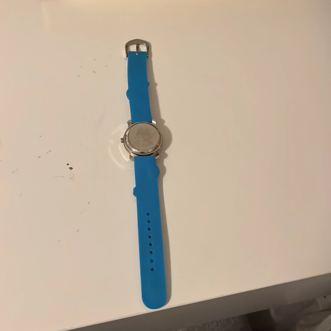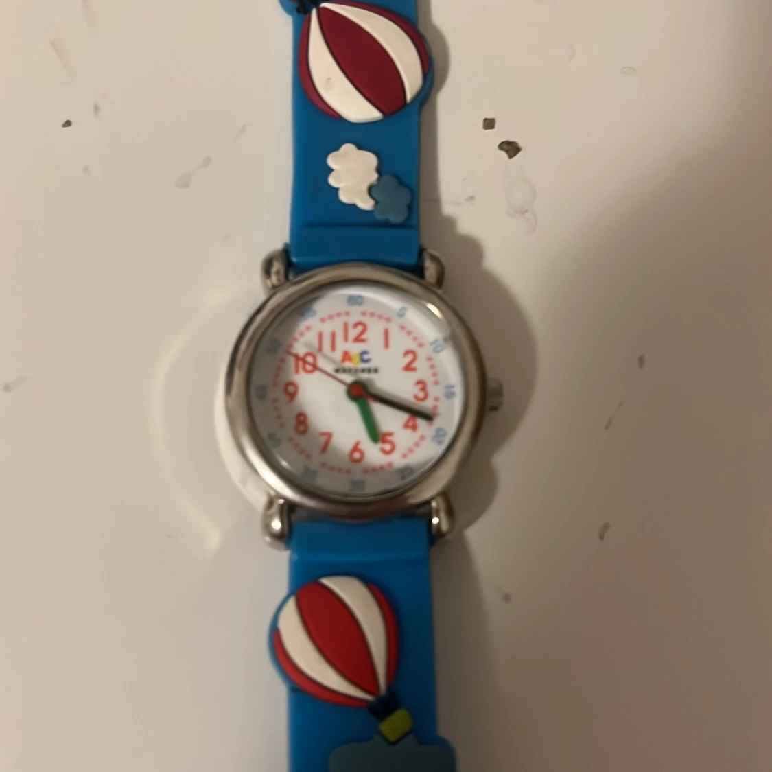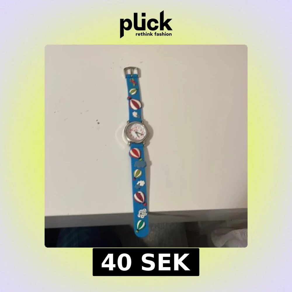 Charmig barnklocka med blått armband dekorerat med luftballonger och moln. Urtavlan har tydliga röda siffror och gröna visare, vilket gör det enkelt att läsa av tiden. Perfekt för barn som älskar färgglada och lekfulla accessoarer.