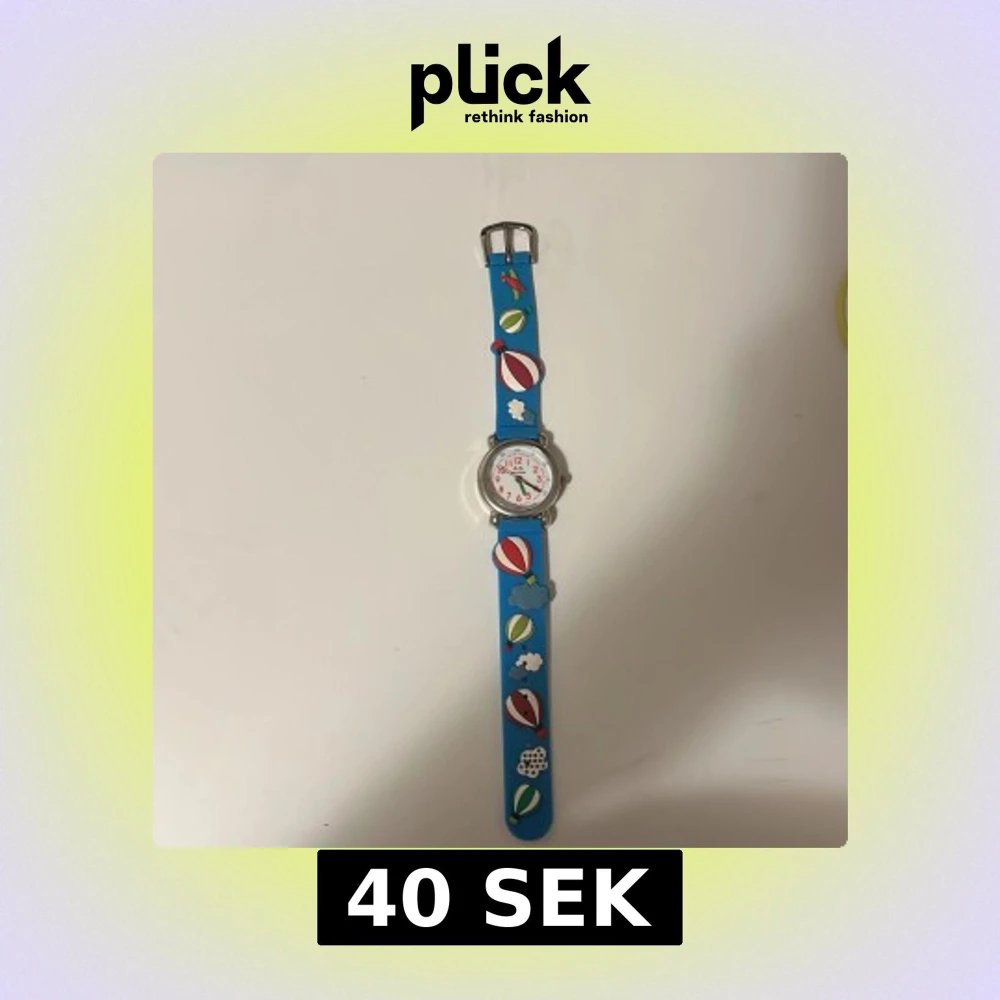 Charmig barnklocka med blått armband dekorerat med färgglada luftballonger och moln. Klockan har en tydlig vit urtavla med röda siffror och visare. Perfekt för barn som lär sig klockan!
