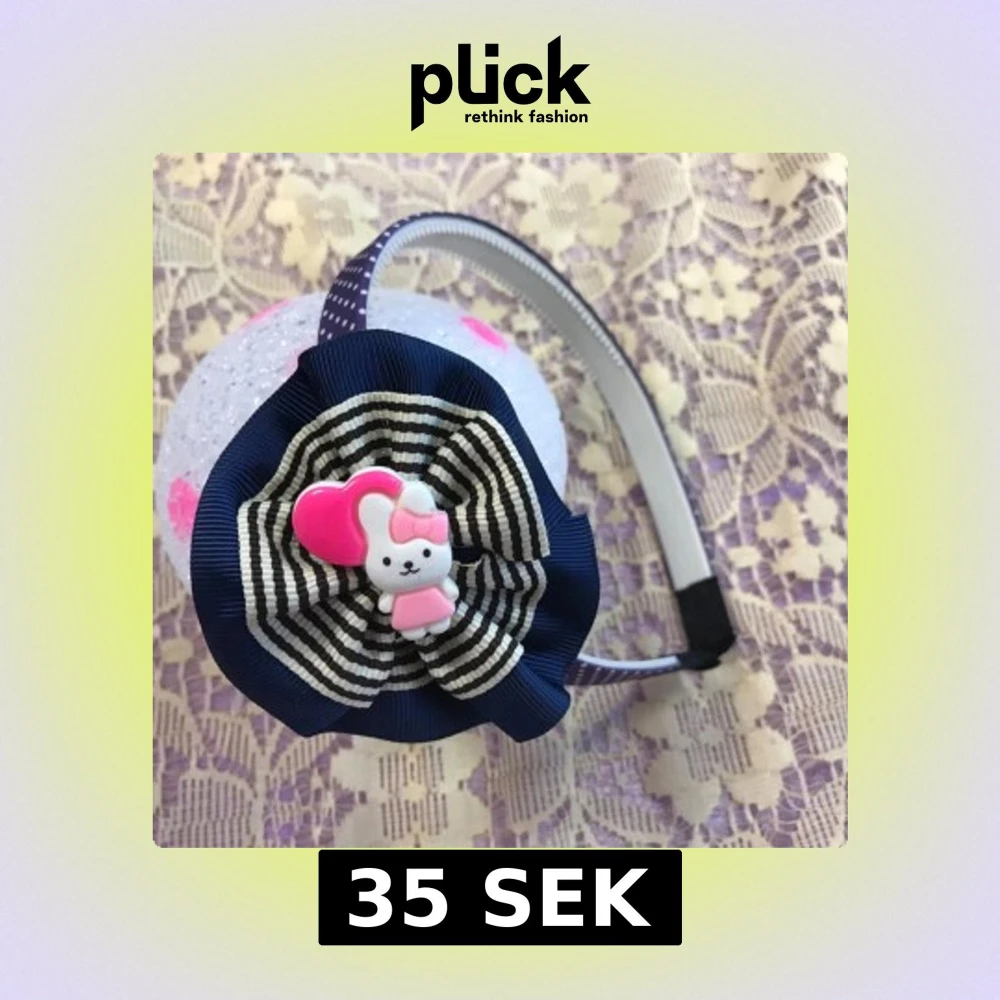 Tre gulliga diadem med rosett med rosa klänning och hjärta. Ett diadem har marinblå och vitrandig rosett, de andra har ljusrosa rosett. Diademen har olika färger på bandet: mörkblått med prickar, beige med prickar och grönt. Perfekt för att ge din look en söt touch. 35kr/st , helt ny
